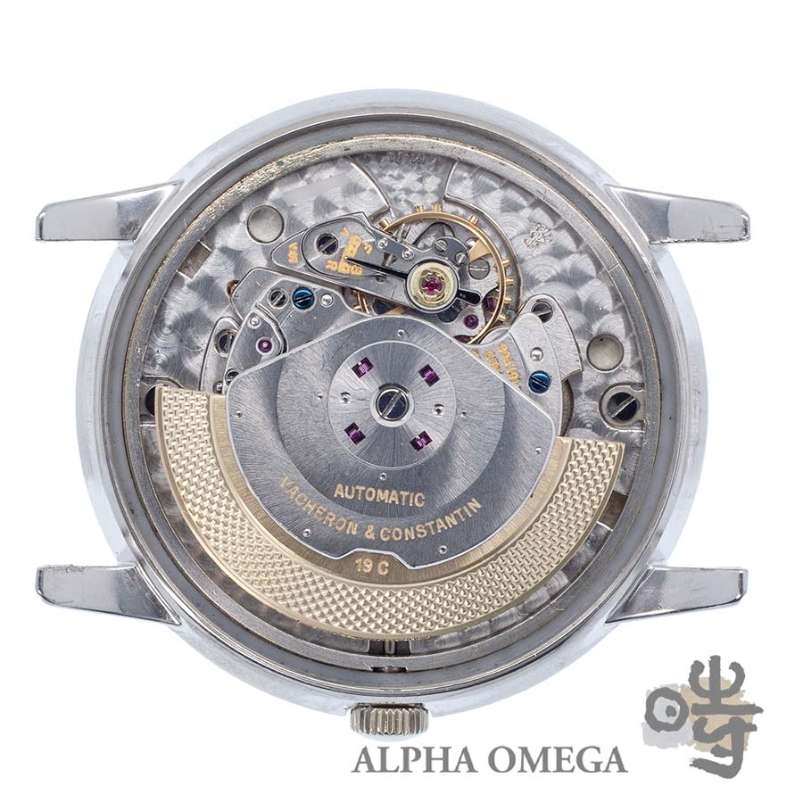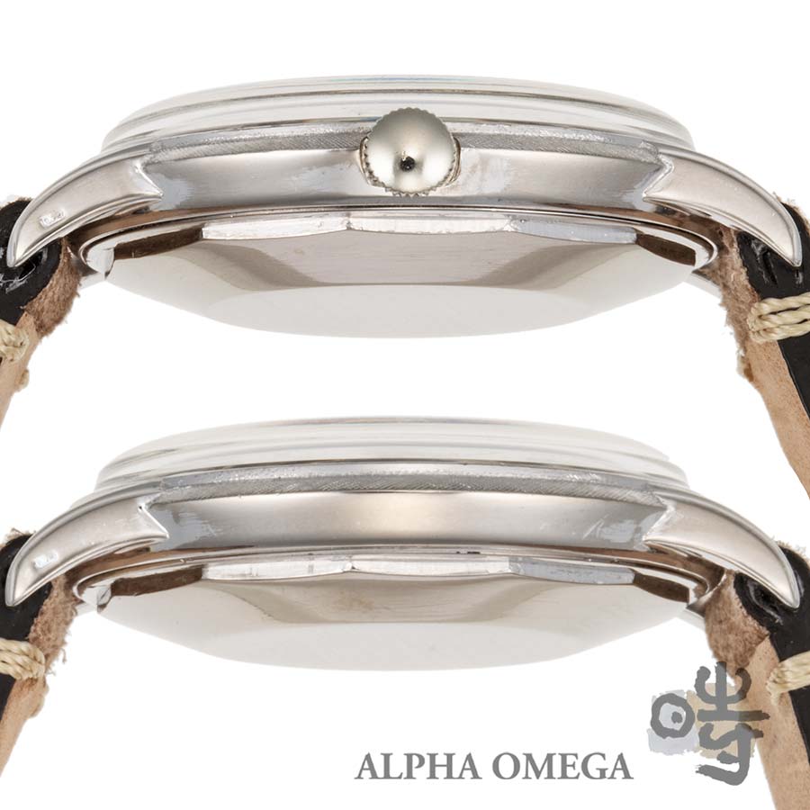 当時のヴァシュロンは3大時計ブランドの中でも年間の生産本数が最も少ないブランドでした。まずは何と言ってもケースの仕上げに驚かされます。鏡面仕上げとフィレンツェ仕上げがミックスされたステップケースになっており、鏡面とのコントラストがダイアルをケースサイズ以上に際立たせています。針は美しい山形のドルフィン針で長針の先端は風防に合わせてしっかりと曲げられています。針の1本1本は先端を磨き上げられており、ルーペで見ても息を呑む仕上がりです。