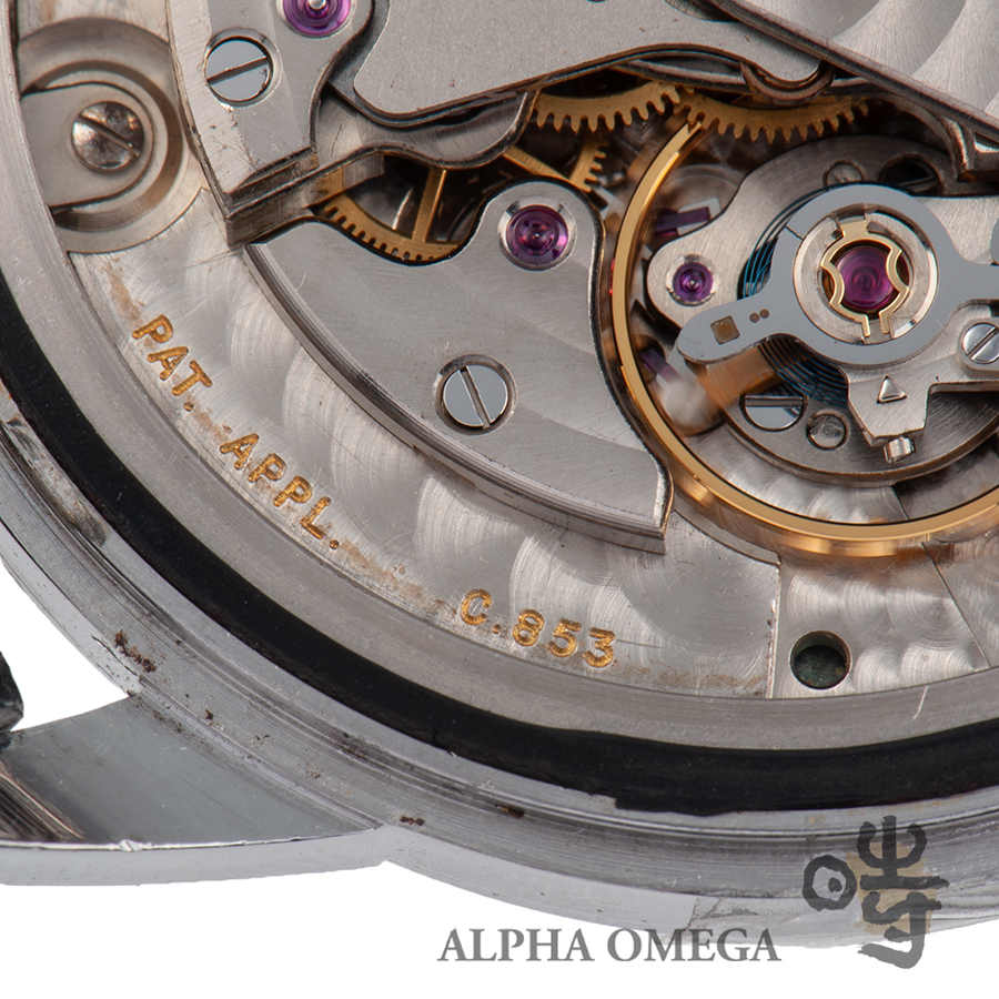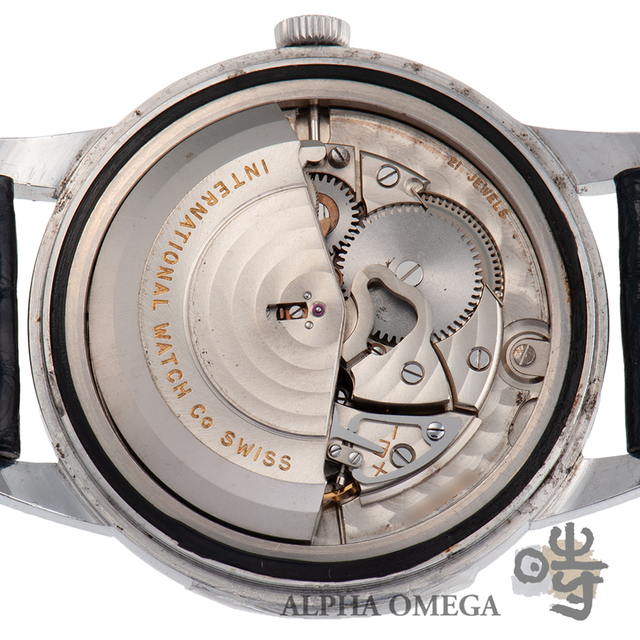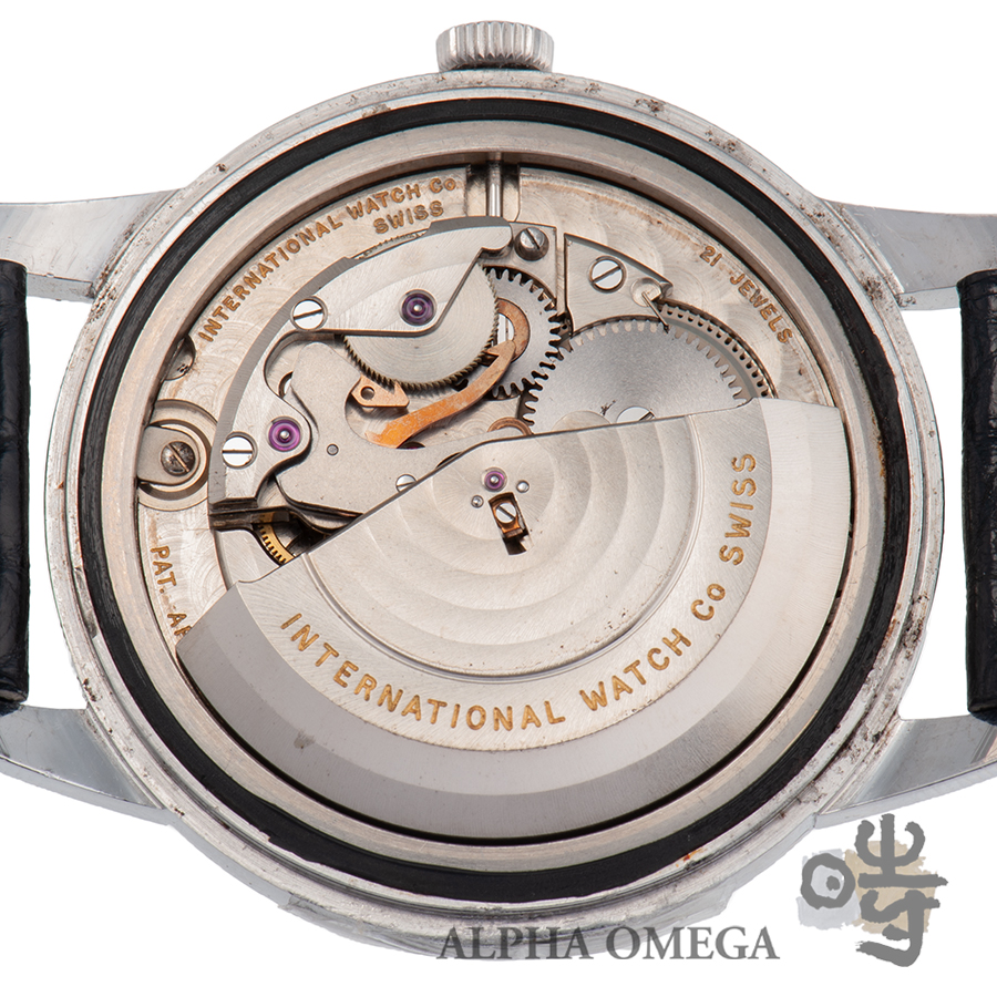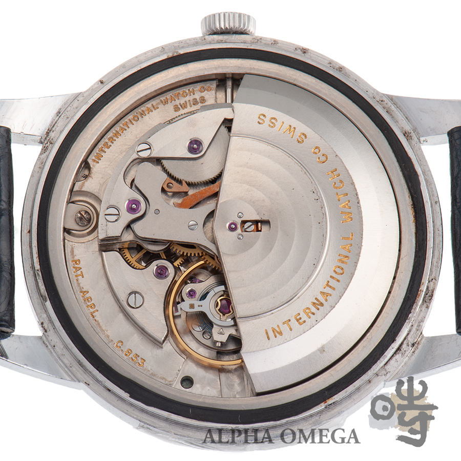 ダイアル経年変化こそ出ていますが、地板にキズなどは無く、クリア塗料もしっかり残っています。ドーフィン針、パールドット、細目のインデックスは繊細ながら存在感があり古き良きオールドインターです。端正な顔立ちをしており、インターの持つ質実剛健なイメージを象徴する1本です。搭載のムーブメントは、アルバート・ペラトン氏設計のCal.853。IWCのムーブメントの中でも名機と呼び声の高い自動巻ムーブメントを搭載しています。当時の自動巻ムーブメントの中でも頭一つ抜けた完成度のムーブメントとなっています。少ないローターの動きでもゼンマイが巻き上がるよう設計されています。この85系キャリバーはインヂュニアやヨットクラブ、アクアタイマーなどIWCを代表するモデルにも使用されており信頼度の高さが垣間見えます。