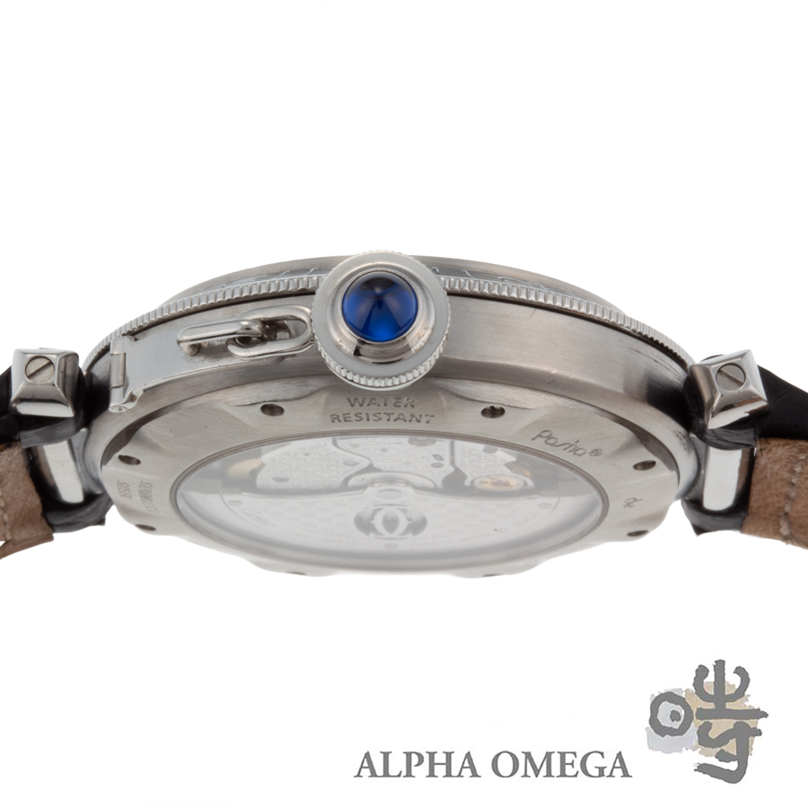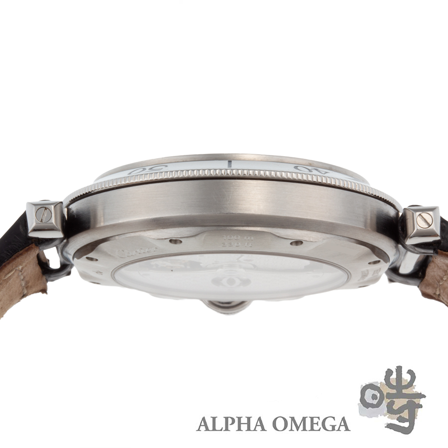 この特徴は何と言っても風防を守るグリッドが装着されている点です。潜水士のヘルメットのようなデザインで、グリッドを付けるとよりスポーティな印象を受けます。グリッドを外せば通常のパシャが持つラグジュアリーながフォーマルな雰囲気を演出でき、使うシーンに分けて選ぶことが出来ます。またケースサイズも38mmと大きすぎ絶妙なサイズとなっております。2005年のモデルチェンジ後には40mとサイズアップが行われ、38mmサイズを探されるお客様も多いです。ムーブメントにはジラールペルゴ製のCal.3100をチューンナップしたCal.191が使用されています。裏蓋はスケルトン仕様となっておりカルティエらしい刻印がご覧いただけます。5年ぶりに入荷した状態の良い個体です。