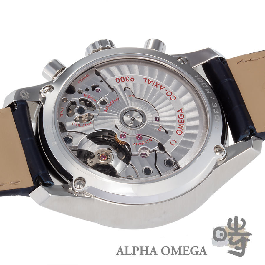 こちらのクロノグラフはケースサイドからムーズメントを覗けませんが、スピードマスター’57と同じCal.9300を搭載したツーカウンタークロノグラフです。スピードマスターと言えば、スリーカウンターのイメージなのでこちらのモデルの方が往年のクロノグラフのイメージにはぴったりです。