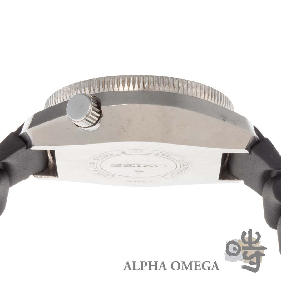 こちらは素晴らしい個体で、通常、6159-7001は裏蓋に浅い円の彫刻と深い円の彫刻が入っていますが、深い彫刻がありません。さらに希少なカウントダウンベゼルとガラスも綺麗です。ケースもエッジが綺麗な未研磨で、セイコースタイルらしい鏡面仕上げとサテン仕上げを織り交ぜた当時の仕上げが残っています。61ダイバーとしてはこれ以上無い希少要素が詰まってるオススメの固体です。(文:S)