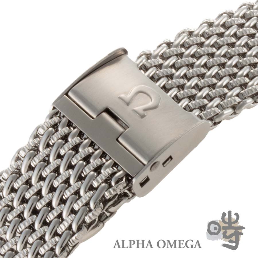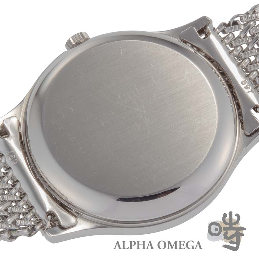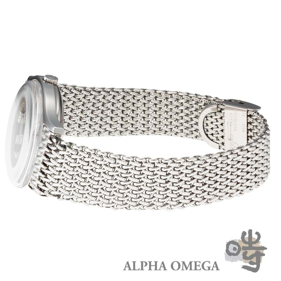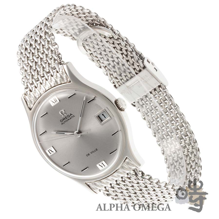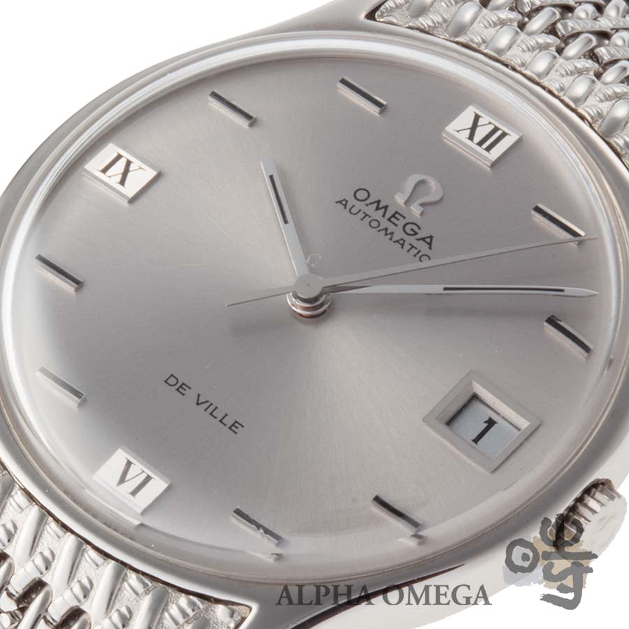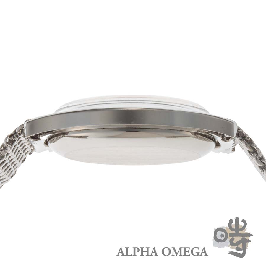 こちらは1970年代のデ・ヴィルで、特徴的な文字盤デザインが目を引きます。横向きに配置されたバーインデックスに加え、6時、9時、12時のインデックスにはローマン数字が配されています。地板にはサンレイ仕上げが施されており、ドレッシーな印象をさらに際立たせています。ケースサイズは33mmの中間サイズで、視認性の良さとドレスウォッチとしての洗練されたイメージが見事に両立した、まさに「いいとこ取り」の時計です。ブレスレットは純正のメッシュブレスレットですが、フラッシュフィットやコマに施された彫金が、並々ならぬこだわりを感じさせます。オメガのブレスレットでも、ここまで凝った意匠は珍しいでしょう。カレンダーのクイックチェンジ機能も搭載されており、リューズを1段引いてカレンダー操作、2段引いて時刻合わせが可能です。