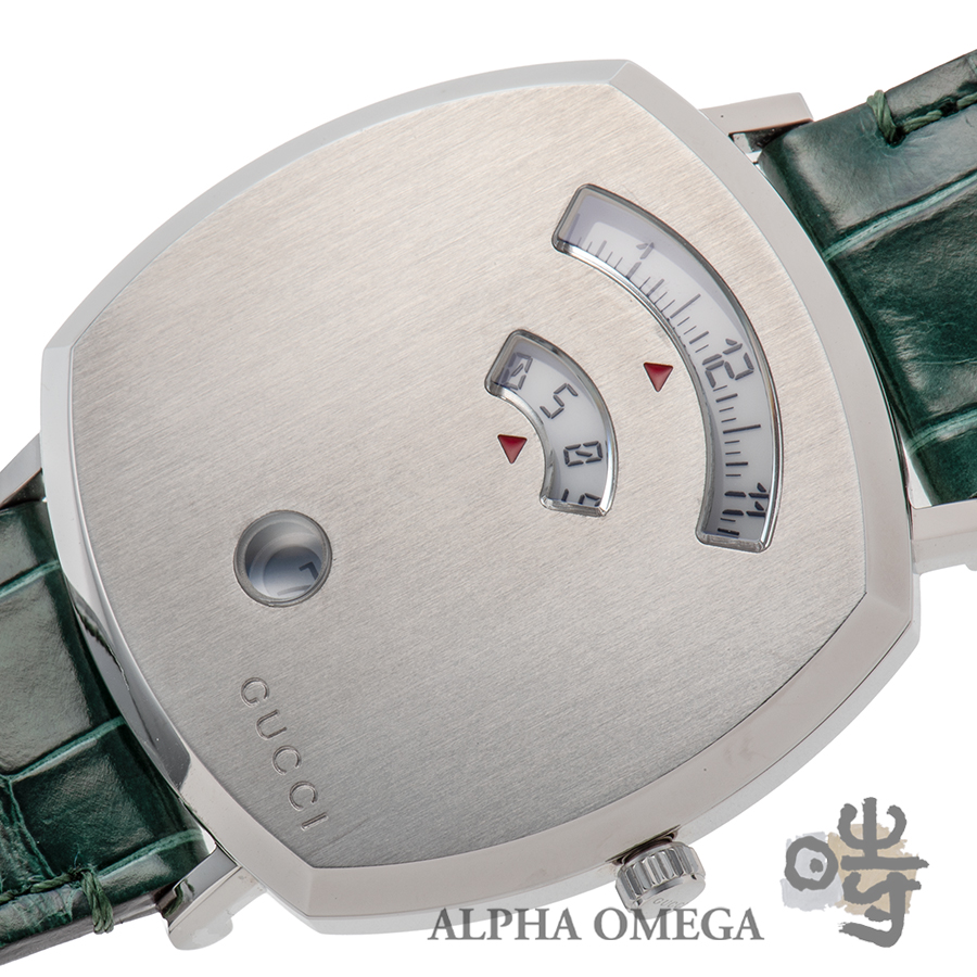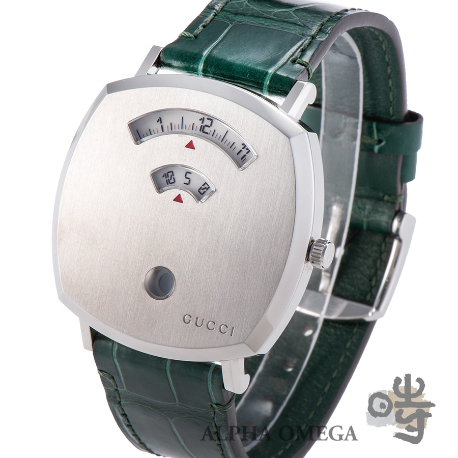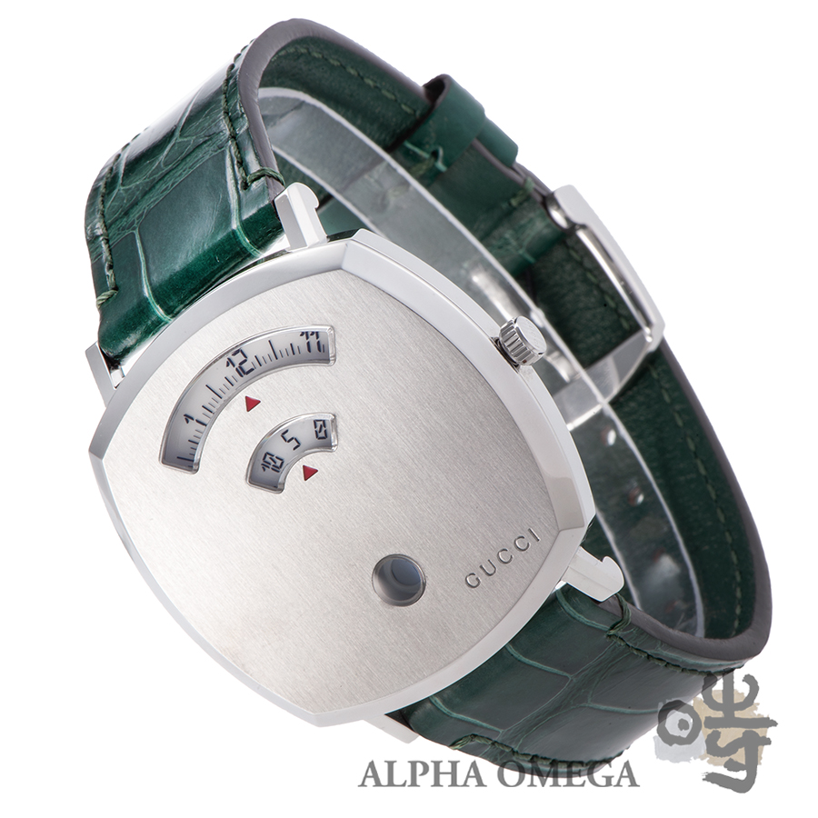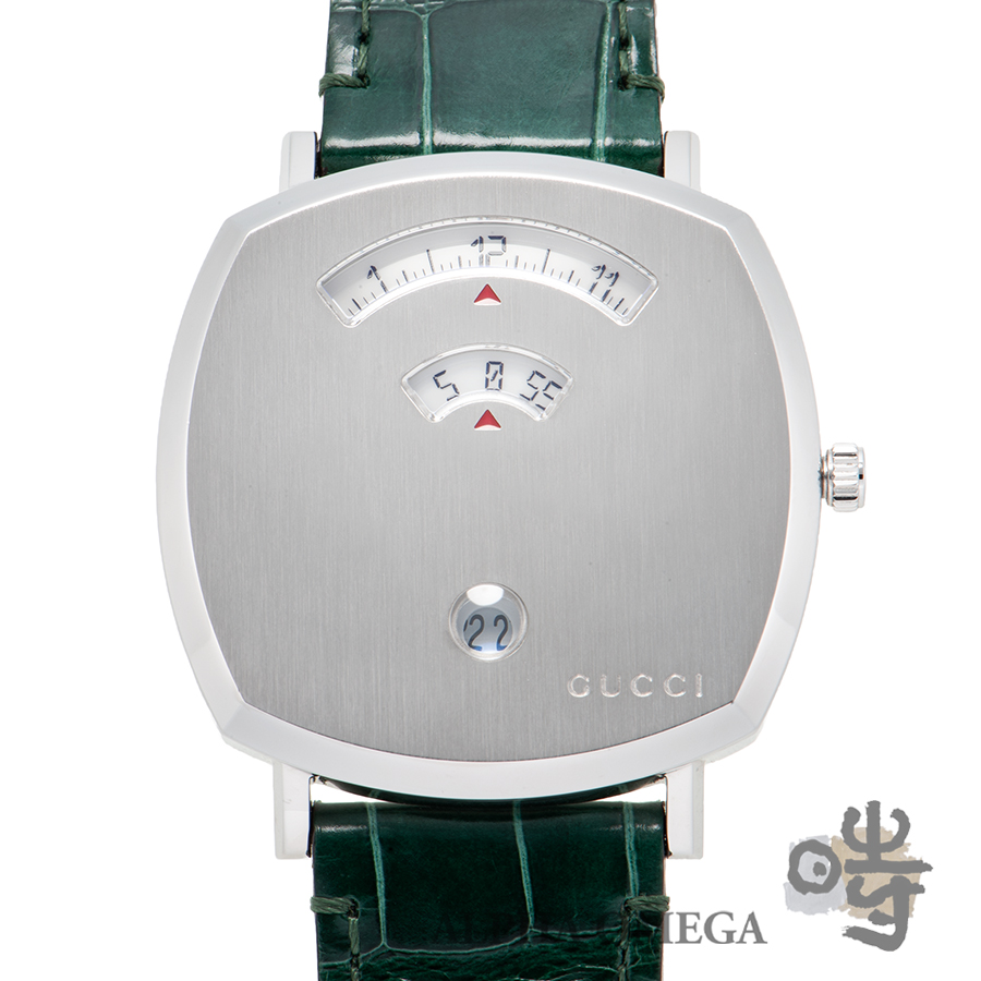 グッチ グリップのご紹介です。こちらはグッチが2019年の新作で発表したグリップウォッチになります。スウォッチグループが撤退し、例年よりも落ち着くバーゼルワールドでひと際バイヤーや愛好家を驚かせたのがこちらのグリップウォッチです。フェンディやグッチのデザインを手掛け、現在はヴァレンティノのクリエイティブディレクターを務めるアレッサンドロ・ミケーレがスケートボードのグリップ(滑り止め)から着想を得て作られたデザインは、どこか70年代のデジタルウォッチを連想させる出来栄えとなっています。またクォーツ式となっていますのでケースも薄く作られています。軽いため装着感も良く、デザインと実用性を兼ね備えています。レトロフューチャーなデザインですのでファッションも選ばずにご愛用頂けます。こちらは未研磨の中でもケース・ベルトの使用感が少ないオススメの1本です。皆さまはこの時計を見て最初に何をイメージされましたでしょうか?(文:S)