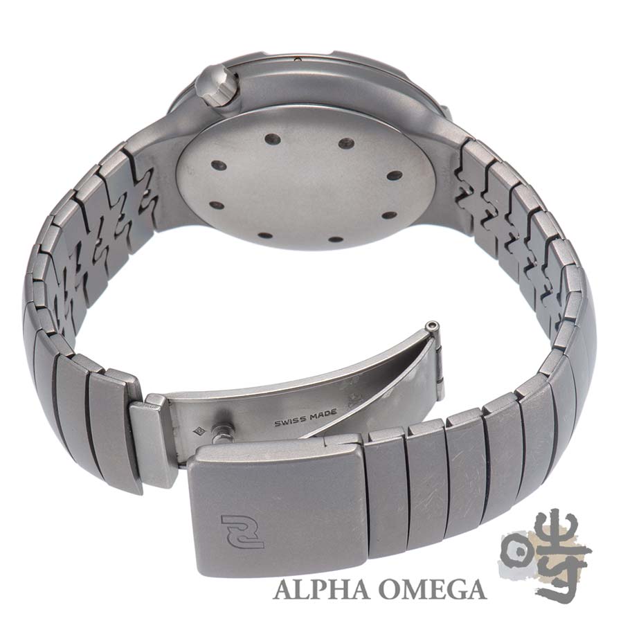 こちらは加工の難しいチタンを使用したオーシャン2000です。オーシャンシリーズはオーシャン500とオーシャン2000が製造されました。オーシャン2000はIWC初のダイビングウォッチであり、2000m防水という驚異的なスペックでした。オーシャン2000は1982年~1998年までの約16年間製造されていましたが、定価が高価であった点などから製造期間の割に出回った本数は少ないと言われています。当初はドイツ海軍向けのダイバーズウォッチとして製造されており、その民生品として誕生した経歴があります。オーシャン2000には製造年ごとにブレスレットの種類が4パターン存在しており、こちらは最初期のブレスレットになります。初期のブレスレットは状態の良いものは少なく、オリジナル性を担保する意味でも重要なパーツとなっています。こちらは通常のチタンよりも色が濃いタイカンの個体となっています。タイカンとはカーボンでブラック表面硬化を施した初期のカタログに載っている希少モデルで、製造数は1985年に100個から200個と言われています。また、IWCが製造したポルシェデザインの時計には、IWC表記の物とポルシェデザイン表記のものが存在します。これは当時の販売元が正規であった場合、IWCの表記が入り、ポルシェデザインの直営店で購入した場合、ポルシェデザインの表記が入っていたのではないかと推測しています。
