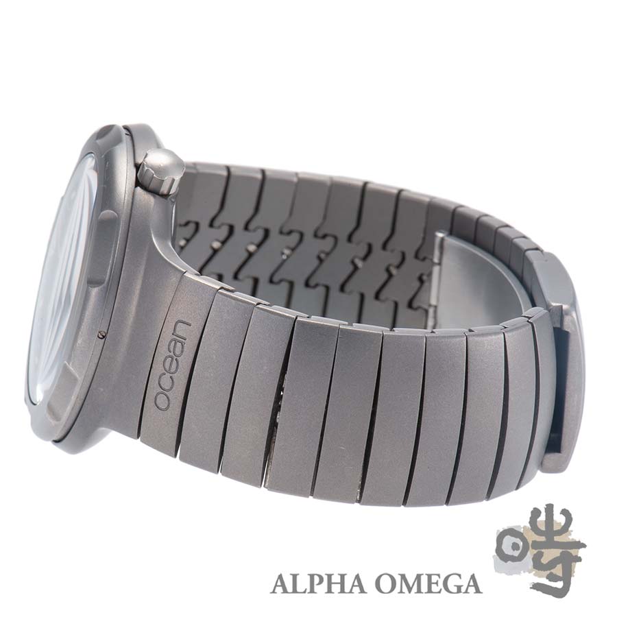 状態はチタンの剥げが見られない未研磨の個体となっています。ブレスに使用に伴う傷はございますが、地の色が通常よりも濃い黒なので目立ちません。ダイアルの夜光塗料はクリーミーに経年変化しており、ヴィンテージモデルとしてのオーラを感じます。 オーシャン2000の中でも初期ダイアルとブレスレットの整合性の取れた組み合わせのお勧めの個体です。(文:S)