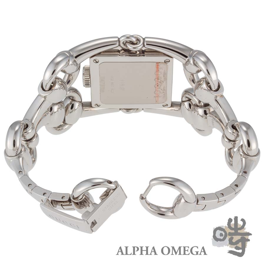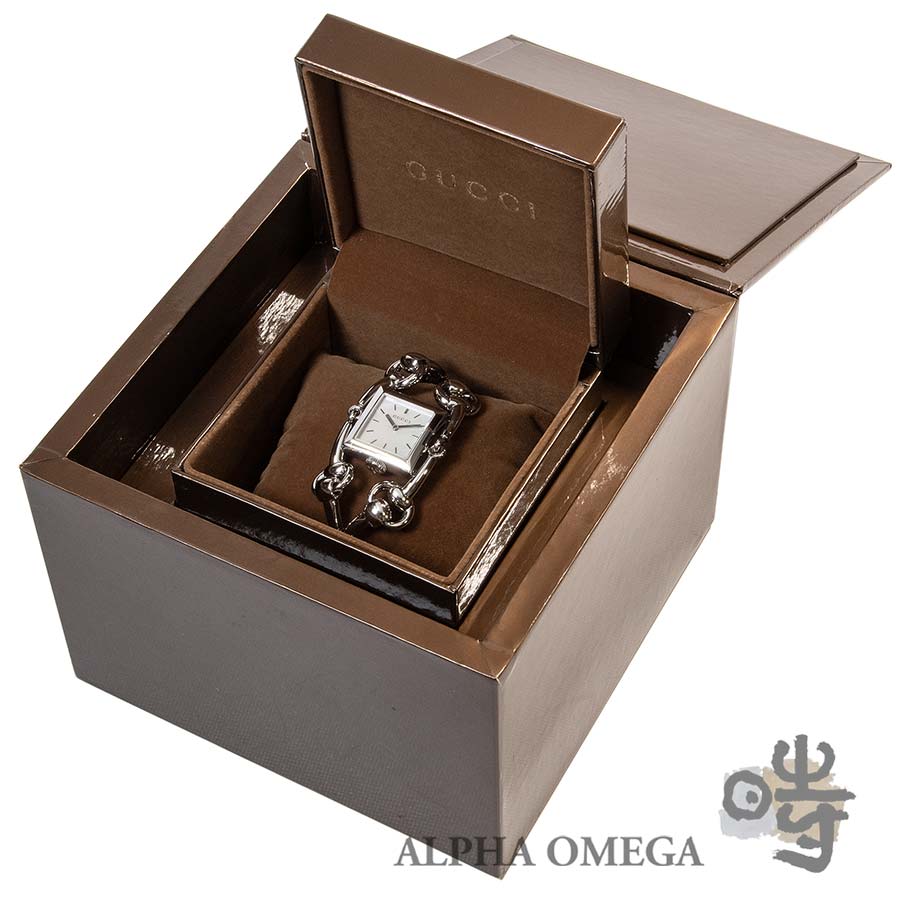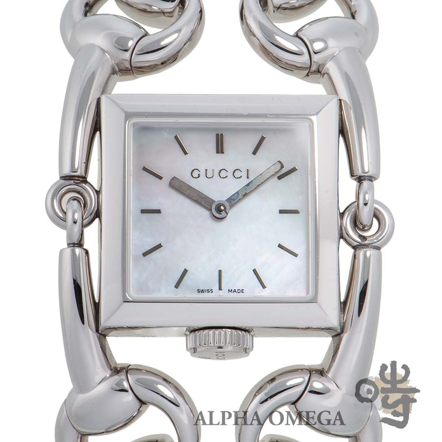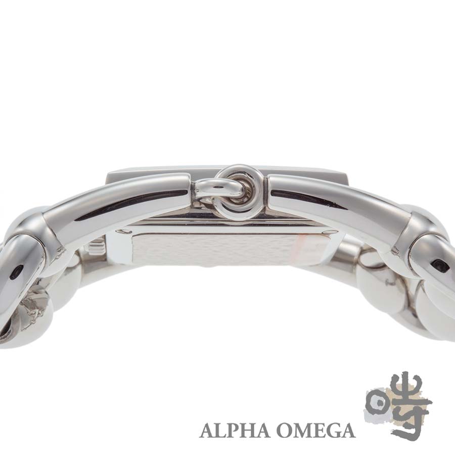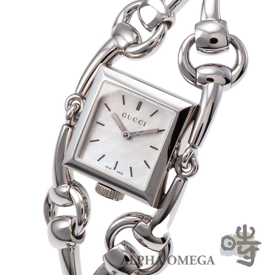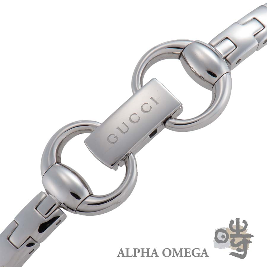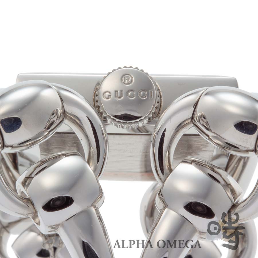 グッチはハイブランドの中でも特に時計製造に注力しており、デイリーユースに適したモデルからユニークピースまで、幅広いラインナップを展開しています。こちらは独創的なデザインが印象的なシニョーリアです。グッチの代名詞とも呼べるホースビットモチーフをチェーンのようにつなぎ、幅広のブレスレットと一体型の時計として落とし込んでいます。工業的な印象も持ち合わせておりますのでユニセックスでご使用頂けるデザインとなっております。