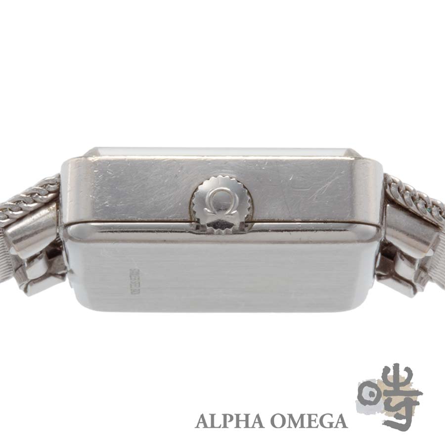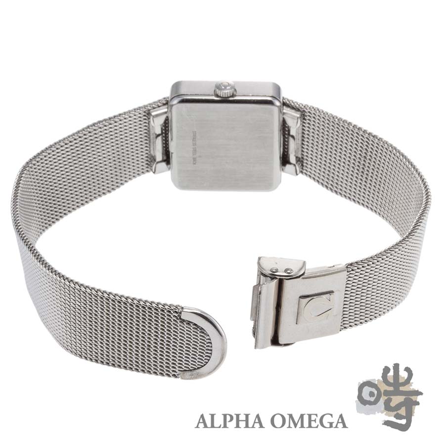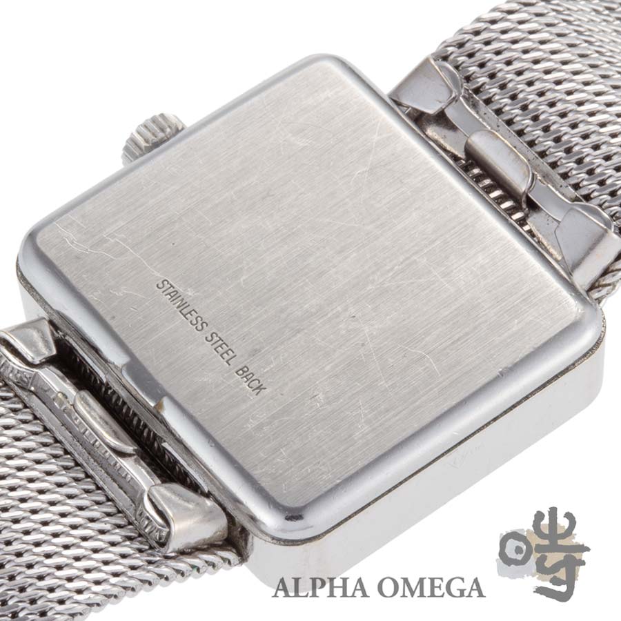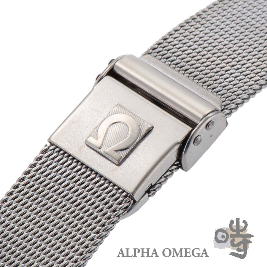 ご紹介するエメラルドは、シンプルなデ・ヴィルでありながら、風防にエメラルドカットを施した点が特筆されます。これはジュエラーであるグリマの影響が色濃く出ており、美しいフォルムを再現しつつ、角の欠けを防ぐという機能美を両立させています。文字盤の経年変化は少なく、未研磨の個体です。ケースには若干の摩耗感が見られるものの、鏡面仕上げはしっかりと残り、当時の刻印も薄れることなく鮮明に残っております。オリジナルのメッシュブレスレットは若干癖があるものの良好な状態を保ち、バックルのオメガロゴも通常のモデルより大きく中央に配置されたデザイン性の高い仕様です。