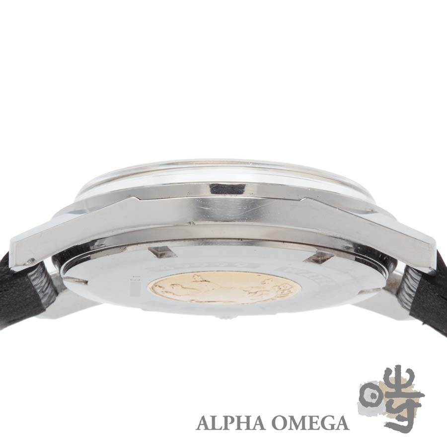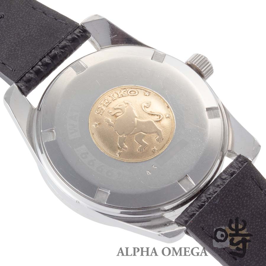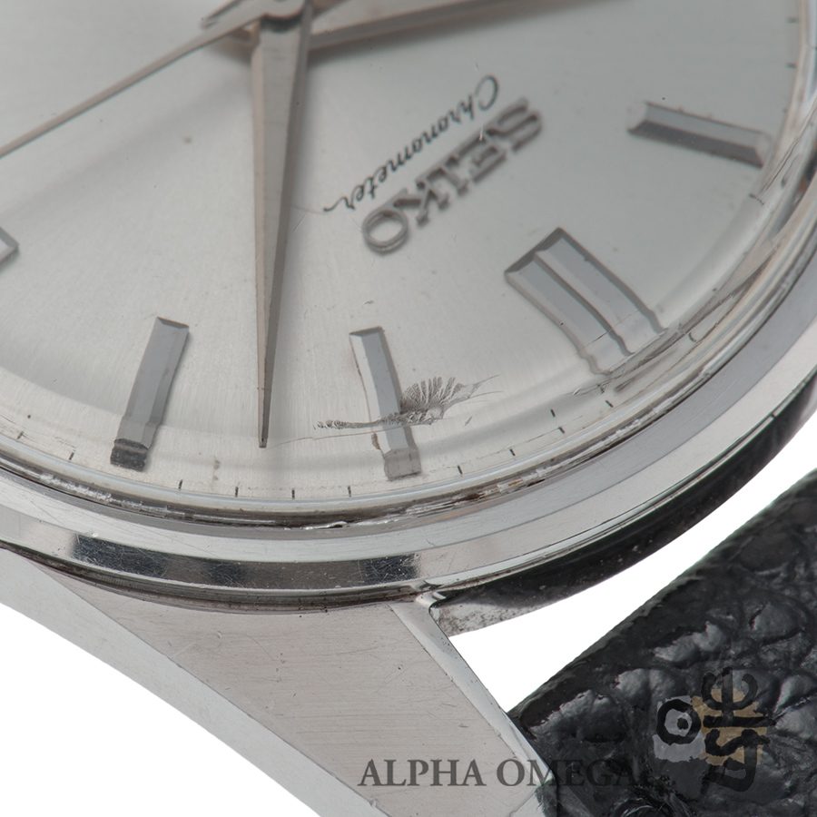 この個体の文字盤は、製造初期型にのみ見られる筆記体の「Chronometer」表記を持つ、非常に人気の高い仕様です。インデックスにはホワイトゴールドメッキを用いたAD文字盤が採用されています。裏蓋には、クロノメーター規格をクリアした証である獅子メダリオンが美しく鎮座しています。ケースデザインは、セイコースタイルが確立されるまでの過渡期にあり、ラグの形状などに、後の「セイコースタイル」の片鱗が色濃く現れています。秒針も初期型特有の先端が矢じり型のものです。