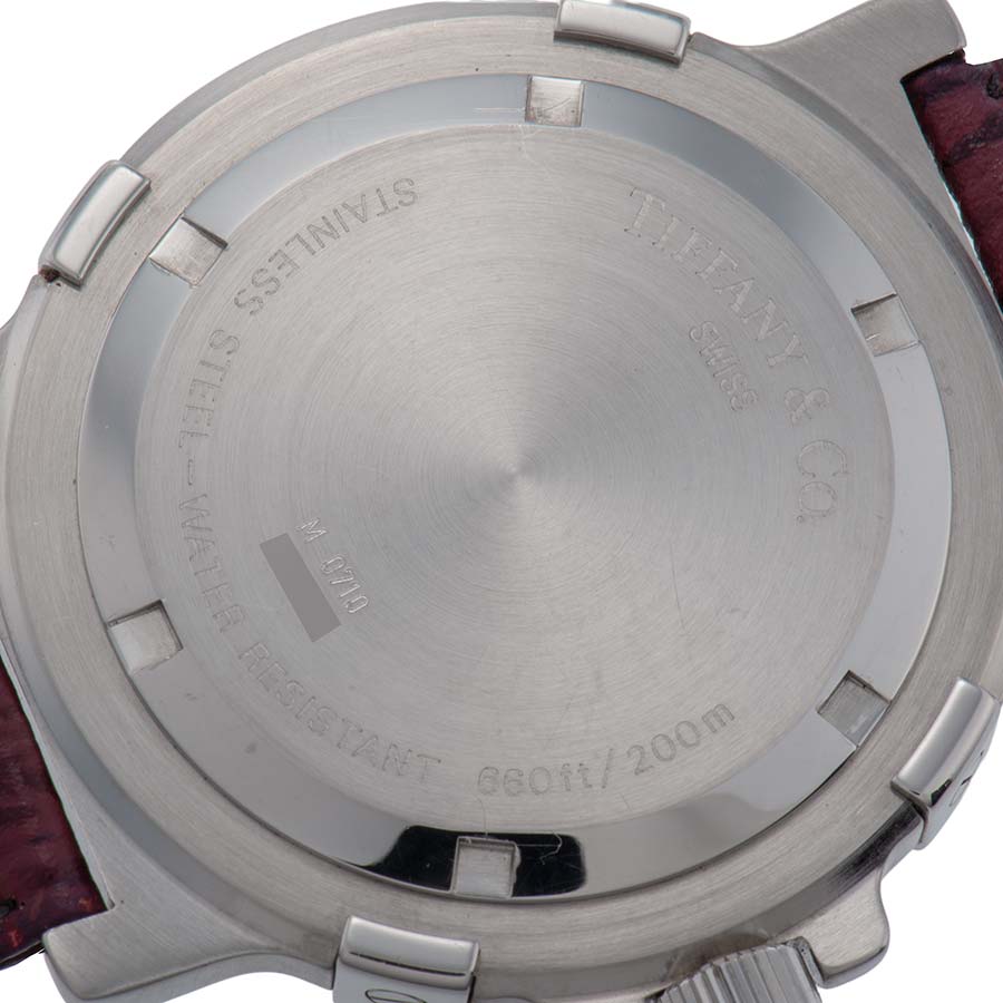 こちらは1990年頃に製造されたティファニーのダイバーズウォッチです。それまでドレスウォッチなどのクラシックな時計を手掛けていたティファニーとしては意欲的な作品とも言えます。32mmと38mmのサイズ展開があり、こちらは38mmとなっています。ブラックとブルーのカラーが多い中、こちらは珍しいボルドーカラーとなっています。ティファニーとしては珍しいスポーツウォッチです。逆回転防止ベゼル付きのシンプルなダイバーズデザインですので癖がなく、使いやすいモデルとなっています。