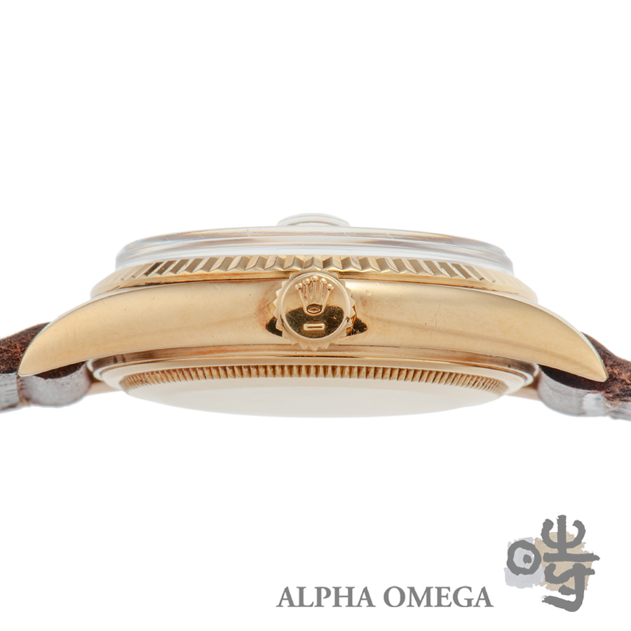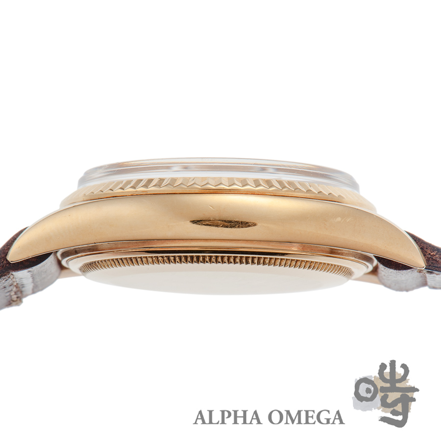 こちらの文字盤は珍しい「ドアストップ型インデックス」を備えたデイデイトです。通常のドアストップ型インデックスは、上下両方に角度がついているのが一般的ですが、この個体は6時側のみに角度がつけられています。同年代のデイデイトの文字盤を調べてみたところ、片側のみをドアストップ型に加工したものがいくつか確認できましたが同じものは無く、文字盤の色も独特なトーンのシャンパンということを考えると、「変わり種」ではないかと推察されます。文字盤の色とゴールドのコントラストがこの個体をより一層際立たせています。