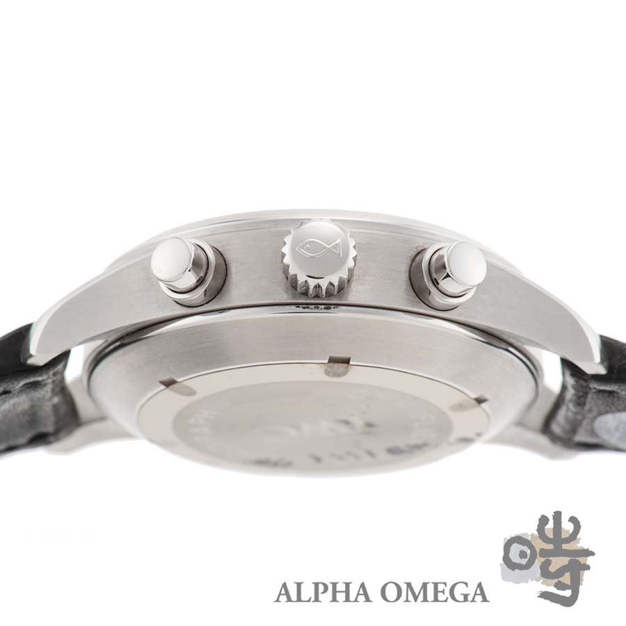 こちらはこちらは出荷当時の保護シールが残った未使用のような未研磨の個体です。フリーガーとフリーガークロノは生産終了後も根強い人気を持ち実用的なので、こうしたシール付きの個体数はかなり少ないと思います。シール付きなのでコレクションとしてもお勧めです。クロノ動作も良好で、エッジやヘアラインのメリハリも綺麗なオススメの個体です。(文:S)