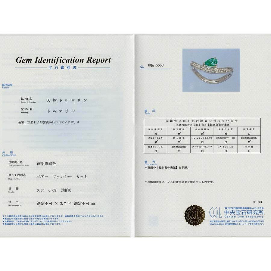 | 素材 | PT900 | 宝石 | センターパライバトルマリン / 脇石ダイヤモンド | サイズ | 12号 | 石目 | センターパライバトルマリン0.340ct / 脇石 ダイヤモンド0.090ct | 重量 | 5.4g |