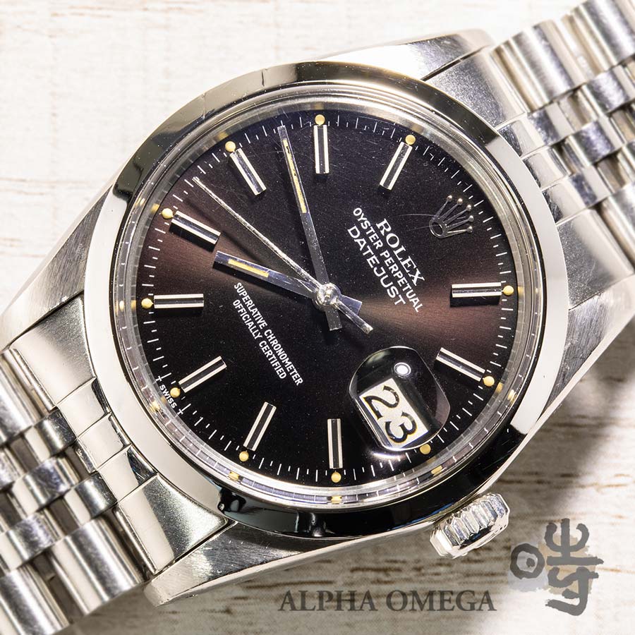 バーインデックスとスムースベゼルの組み合わせは、ドレスウォッチでありながらもどことなくスポーティな雰囲気を持ち合わせており、ビジネスからカジュアルまでシーンを選ばずに着用いただけます。状態は、ベゼル部分に小さな打ち傷が見られますが、その他は年代相応の摩耗感程度で、ケースのエッジなどはしっかりと残っています。特に、年代の合致したジュビリーブレスもヨレが少なく、良好な状態を保っています。Ref.16000の黒文字盤は特に製造数が少なく希少です。夜光塗料はパンプキンで色合いに美しくエイジングされており、プラスチック風防と相まってヴィンテージならではの温かみのある雰囲気が抜群です。日常生活に寄り添いながら、ヴィンテージロレックスの魅力を存分に楽しめる、非常におすすめの個体です。(文:S)