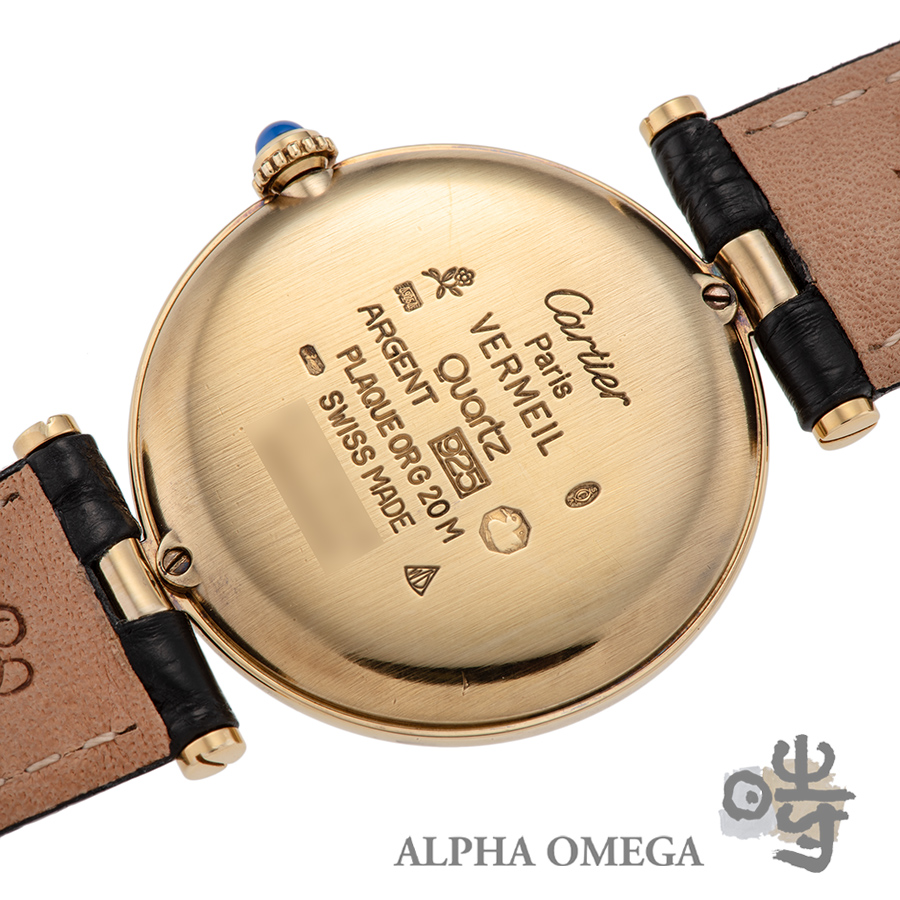 ヴァンドームのケースデザインは、カルティエの時計の中でも長い歴史を持ちます。1933年、創業者のルイ・カルティエがパリのヴァンドーム広場を馬車で通りかかった際、車輪の取り付け部分を見てインスピレーションを得たと言われています。こちらの「マスト ヴァンドーム」は、スターリングシルバーの無垢ケースにゴールドコーティングが施されたヴェルメイユ製法を採用しています。ヴァンドーム広場をモチーフにしたその円形のケースは優美でクラシカルな雰囲気を醸し出します。
