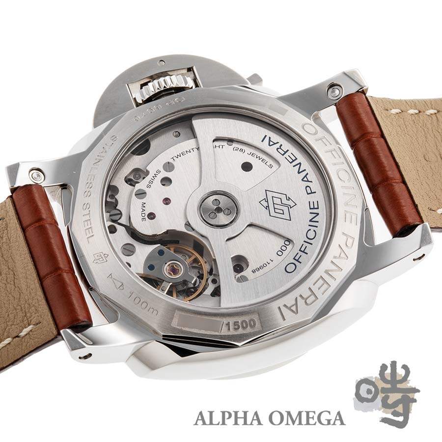 今回ご紹介するのは、2013年に発表された「ルミノール1950スリーデイズ」です。モデル名の「ルミノール1950」は、パネライの初期モデルであるラジオミールからルミノールへとケース形状が変化していく過渡期のデザインを再現したものです。具体的には1930年代のオールドピースのケース形状を復刻しており、ケースサイドのエッジが四隅と交わるような通常モデルとは異なる特殊な構造となっています。ブランドのアイデンティティとなるケースデザインにこだわりをもって製造されていることが伝わってきます。