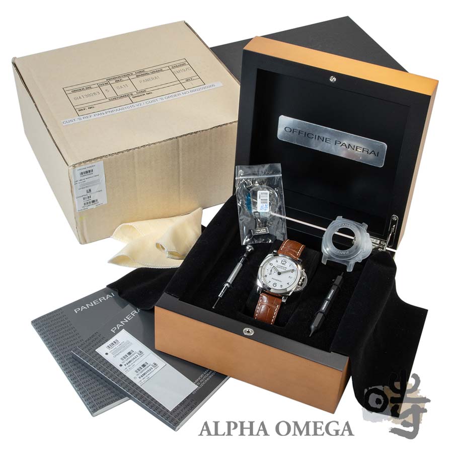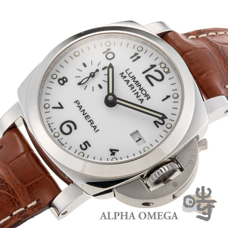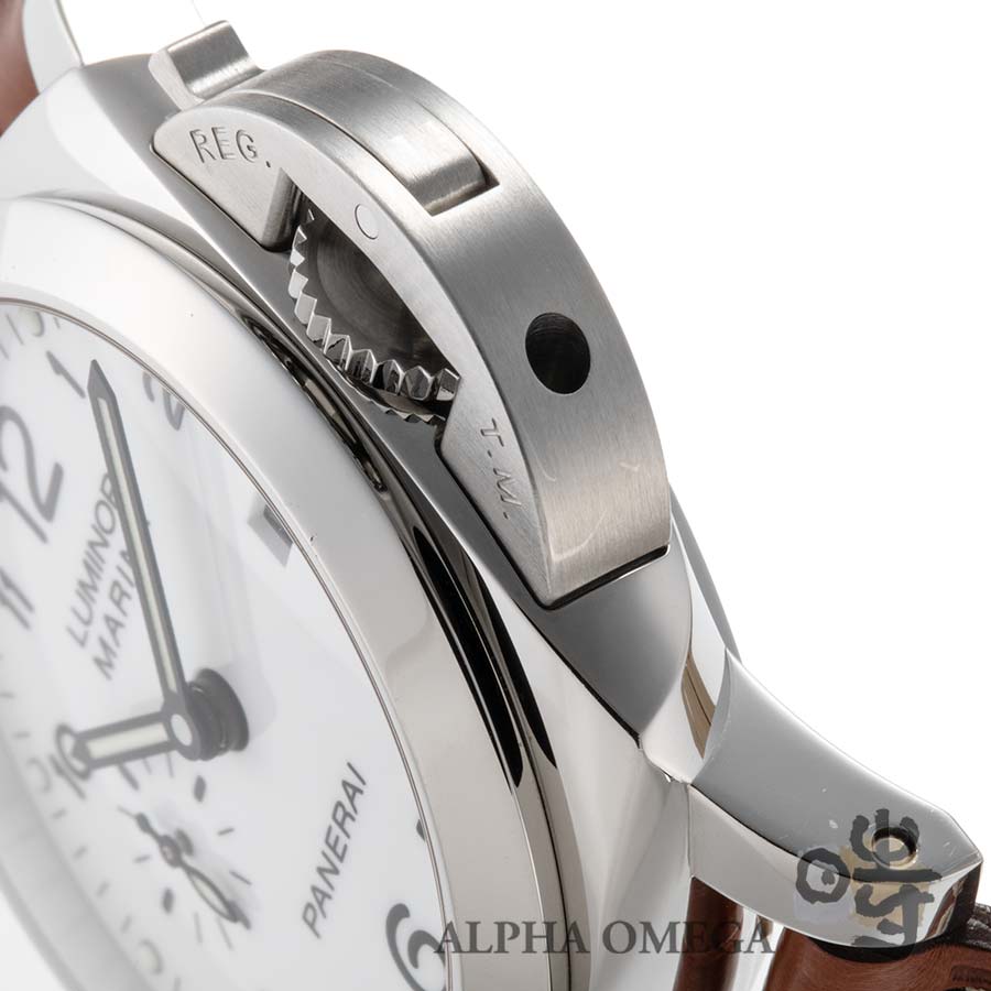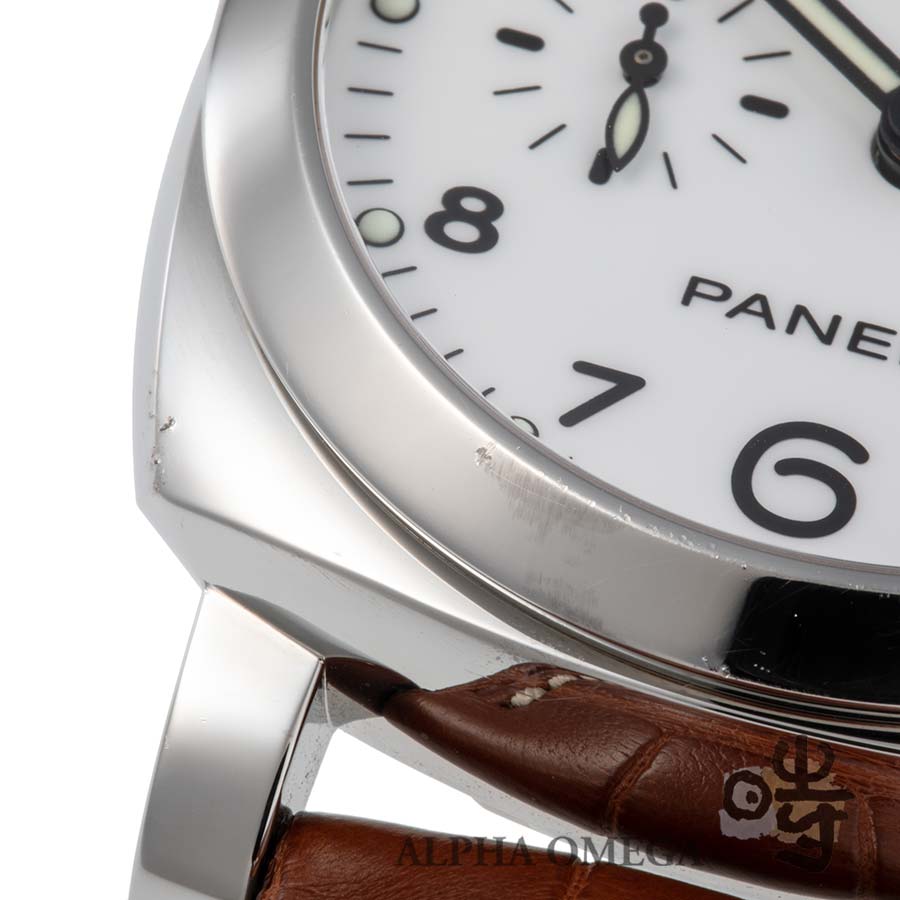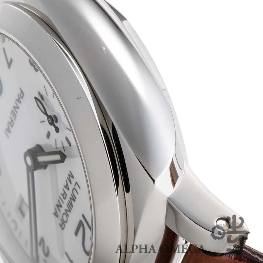 ムーブメントには、パネライの第2世代となる自社製ムーブメントCal.P.9000が搭載されています。このムーブメントは、3日間のパワーリザーブを備え、自動巻でカレンダー付きという日常使いに申し分のない高いスペックを誇ります。文字盤は艶のあるポーセリンのようなホワイトのアラビアインデックスを採用しており、一般的なルミノールモデルの中でも特に視認性が高いのが特徴です。ケースの状態ですが、日常使用に伴う小傷は見受けられますが、最も重要な部分であるケースサイドのエッジはしっかりと残っています。42mmケースでありながら、ケースサイドの特殊な構造により、実際に着用するとサイズ以上に小柄で収まりの良い印象を受けます。ベルトの使用感も少なく、このまま気持ちよくご使用頂けます。箱と保証書が付属する非常におすすめの固体です。(文:S)