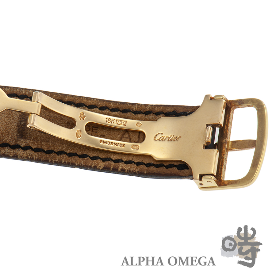 こちらは製造が終了した貴重なクラシックデザインのコレクション、CPCP(コレクション プリヴェ カルティエ パリ)の中でも特に希少な100本限定で販売されたサントスデュモン1913Ref.W1542352です。CPCPは1999年から始まった、カルティエを高級時計メーカーとして指針づけた特別なコレクションで、「プリヴェ」はフランス語でプライベートを意味します。カルティエの芸術的ともいえる装飾品としての美しさや優雅さを、信頼できる有名メーカーのムーブメントと融合させた本格的な機械式時計シリーズとして知られています。ムーブメントにはジャガールクルトのCal.849をベースにカルティエで仕上げたCal.9780MCを搭載、ケースの厚みを約5mmに抑えています。CPCPの中でも唯一オールドモデルを忠実に再現しているモデルで、バックルも他とは違い特別なデザインです。販売方法も特別で、サイズ調整が出来ないヴィンテージのバックルのに合わせて、既に納品が決まった特別なお客様の腕に合わせて製造されました。つまり、一般販売されませんでした。付属の販売促進資料によると、国内で予定された販売数はブティック10本前後となっており、市場への流通数はかなり少なかったと推測されます。