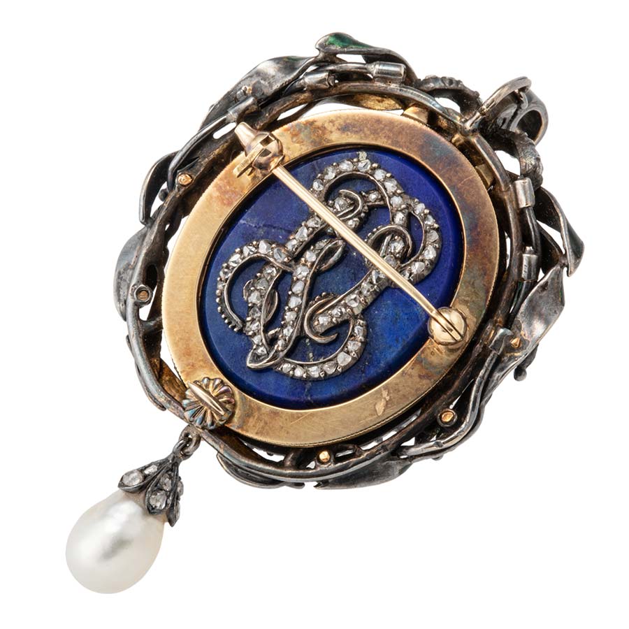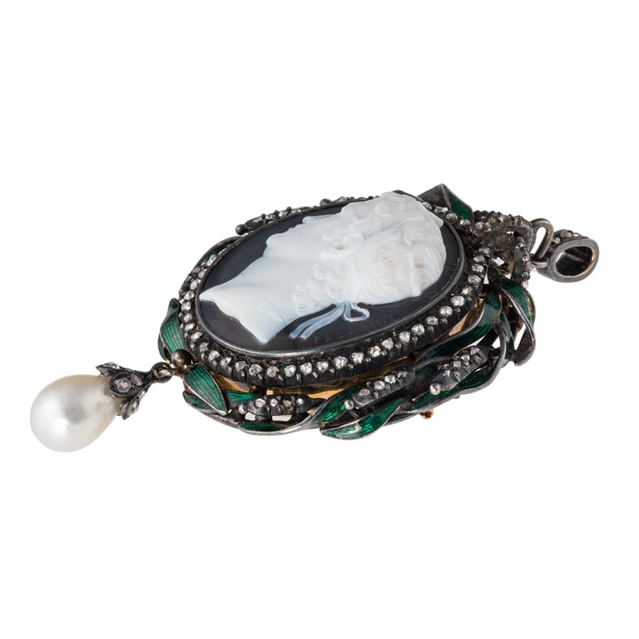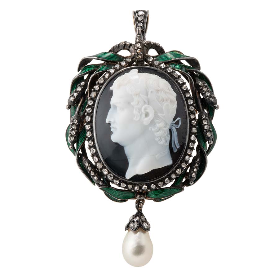 このジュエリーはローズカットダイヤ、天然真珠、エナメル装飾など当時の最高級の材料と最高峰の技巧が施されています。また技巧のみならずジュエリーの装飾に二面的な意味をもたせており、この制作を依頼した人物はかなり教養がありジュエリーのエレガンスをわかっている人物だと思われます。表には古代の帝王アウグストゥスを。裏には当時の権力者ナポレオンのNの頭文字を。そしてそれを取り巻くガマ植物。この装飾に隠された意味が気になる方はぜひアルファオメガのYouTubeチャンネルでご覧になってください。そちらで詳しく説明しております。↓