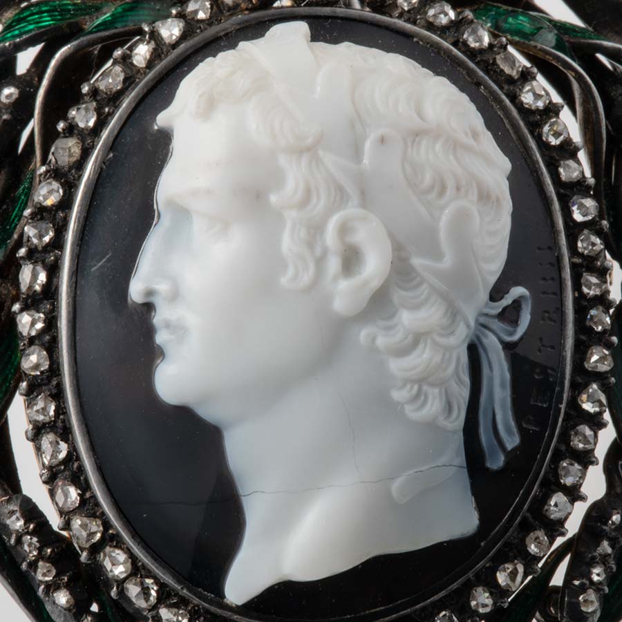 センターのカメオにはアウグストゥスと思わしき人物がサードニクスの上に彫りあげられています。一方で裏を見るとサードニクスとは対照的な色合いのラピスラズリが支えとして留められています。このラピスの上にはナポレオンのNと思わしき文字がダイヤで形作られています。この新古典主義時代はロココ調時代の華美な装飾的文化の反動で荘厳で英雄的なものが好まれ、神話や歴史など古代に立ち返ろうとしている時期でした。当時も依然としてジュエリー自体が貴重で王族や貴族など位の高い人たちのみが身に着ける事が出来るものでした。