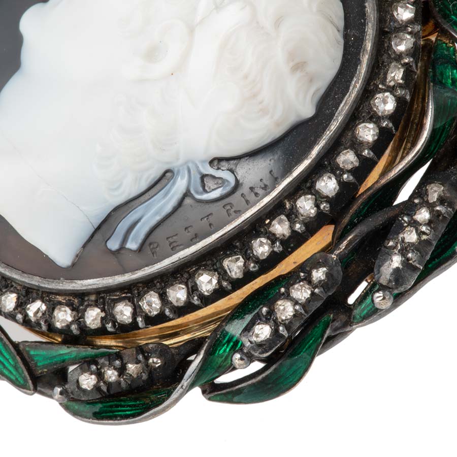 18-19世紀の古典主義時代的な装飾が素晴らしいペストリーニ作のカメオブローチです。カメオの部分を作成したペストリーニはイタリアのカメオ職人で一族で素晴らしい作品を残しています。文献がなく謎多き一族ですが、メトロポリタン美術館やルーブル美術館など名だたる美術館に彼らの作品が残されています。