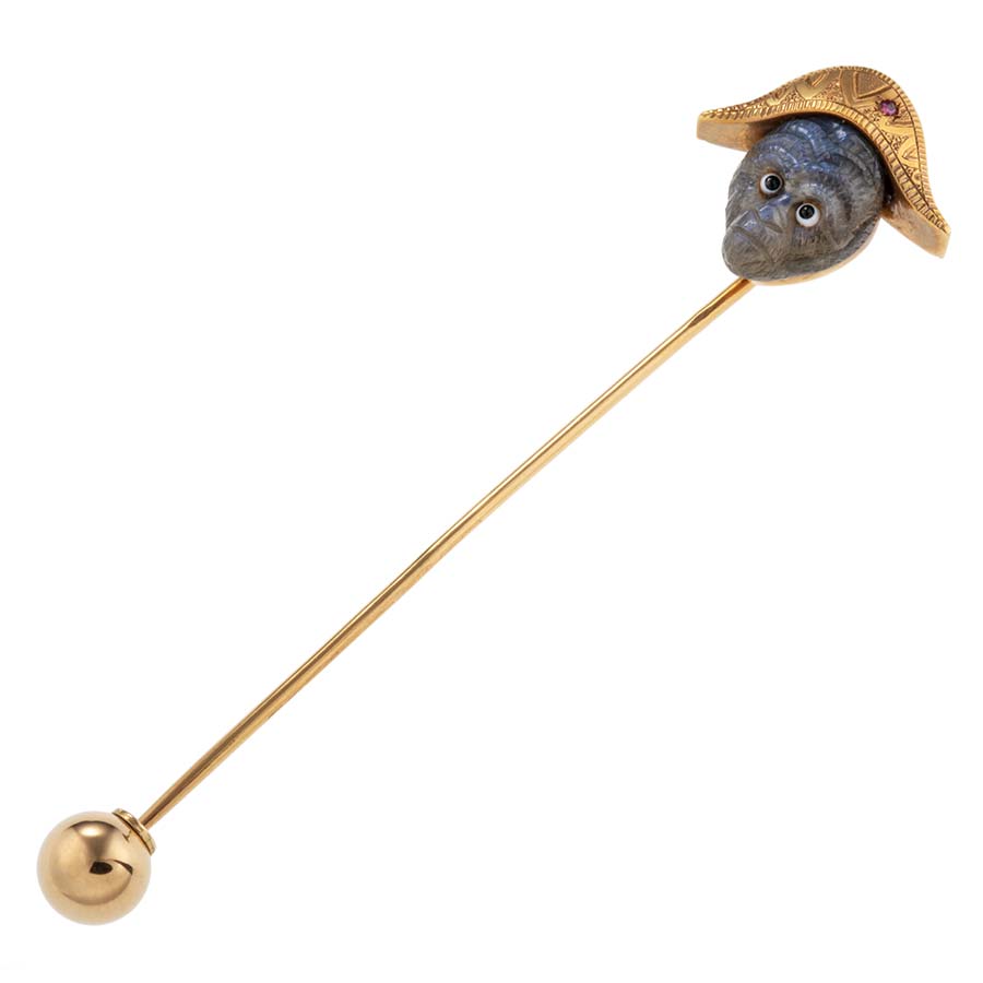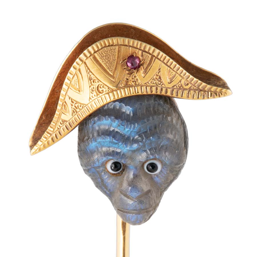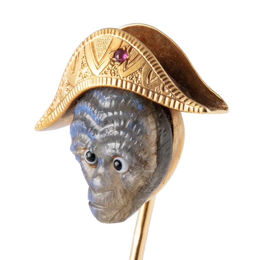 とても面白いアンティークのピンブローチのご紹介です!その名もモンキーナポレオンです。こちらはラブラドライトで作られた猿が18KYGの二角帽子をかぶった作品です。この作品を見て何か感じる事はないでしょうか?まず初めに目につくのは猿の表情です。おどけた様な人をおちょくった様ななんとも言えない面白い表情です。この表情を見事に表現しているのはホワイトオニキスとオニキスです。2種類の瑪瑙を切り出し黒目としてオニキスを絶妙な位置に置いています。