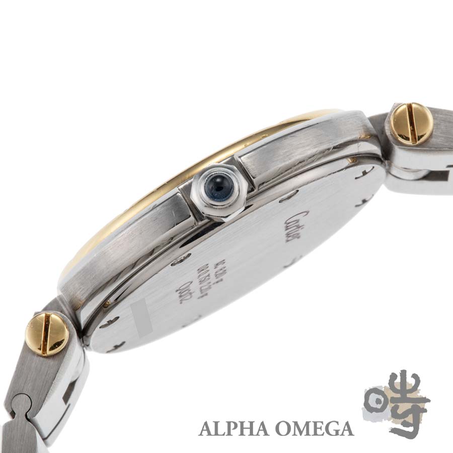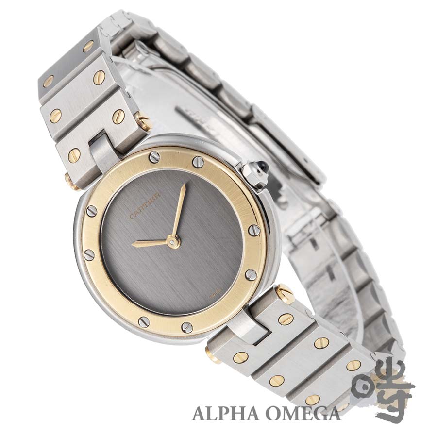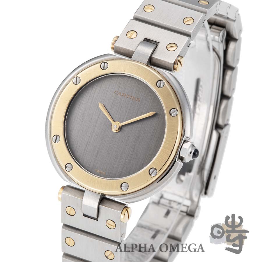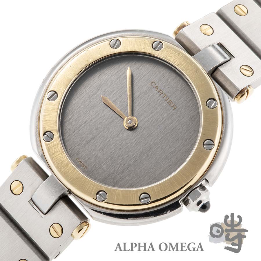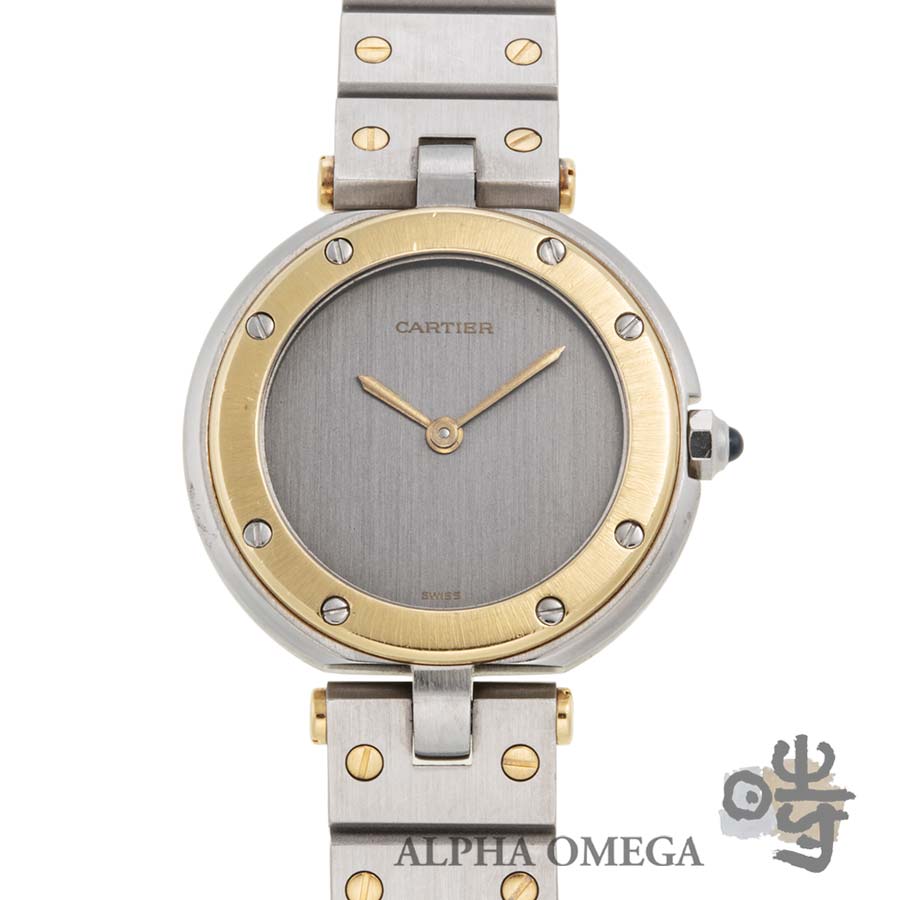 本モデルは、1980年代のわずかな期間のみ製造された「サントス ヴァンドーム」です。当時のシリーズには、四角形の「カレ」、八角形の「オクタゴン」、そして円形の「ヴァンドーム」の3タイプが存在しましたが、流通数はこのヴァンドームが最も少なく希少です。サントス特有のラグジュアリースポーツの意匠を継承しつつ、円形ケースならではのドレスウォッチらしい優雅さを兼ね備えています。その佇まいは、同時期にジェラルド・ジェンタがデザインしたクレドールの「ロコモティブ」を彷彿とさせ、同じくクォーツムーブメントを搭載している点も、時計愛好家にとって興味深い共通点と言えるでしょう。