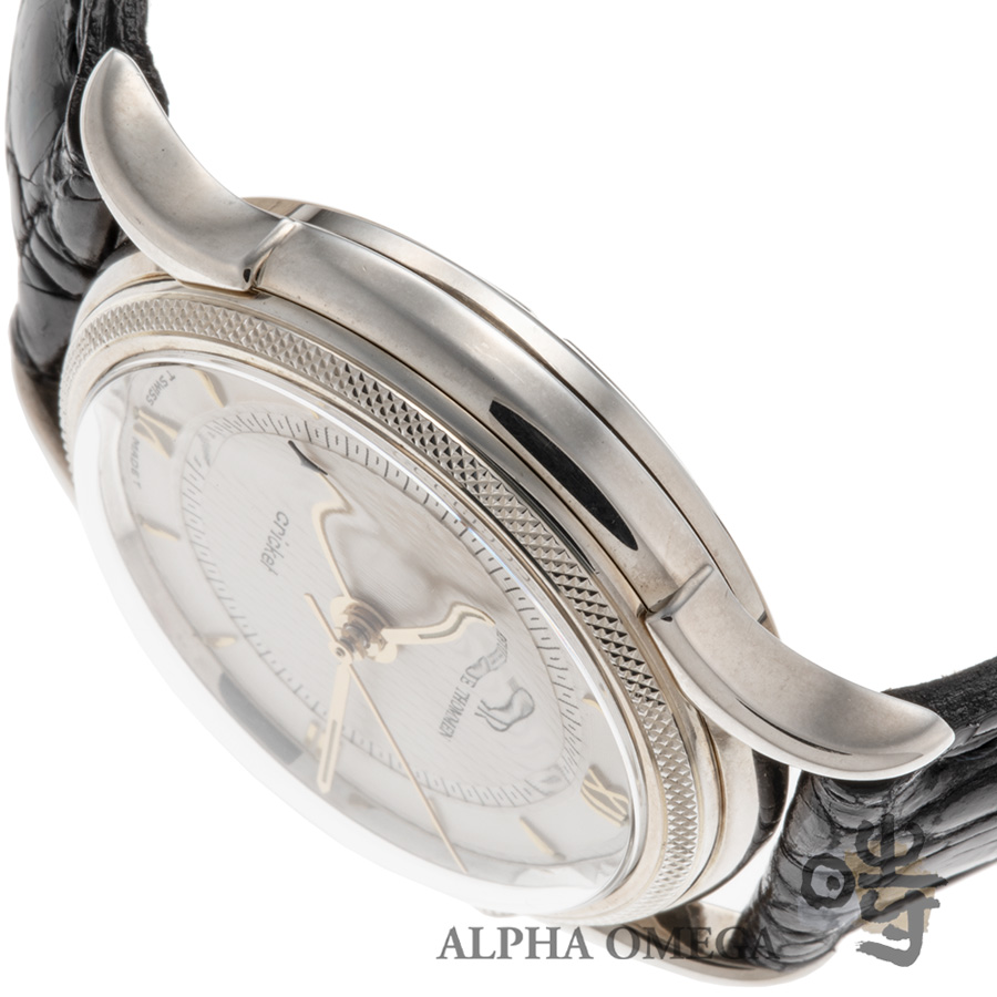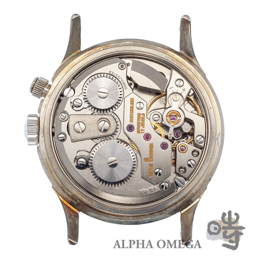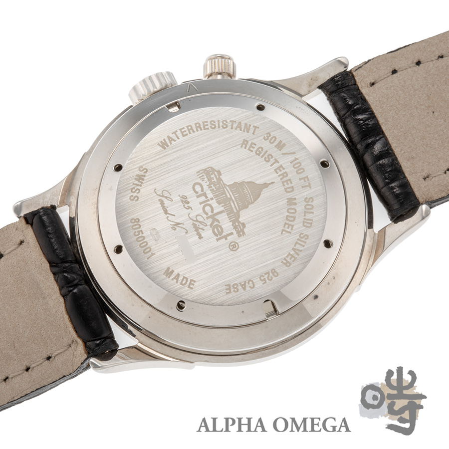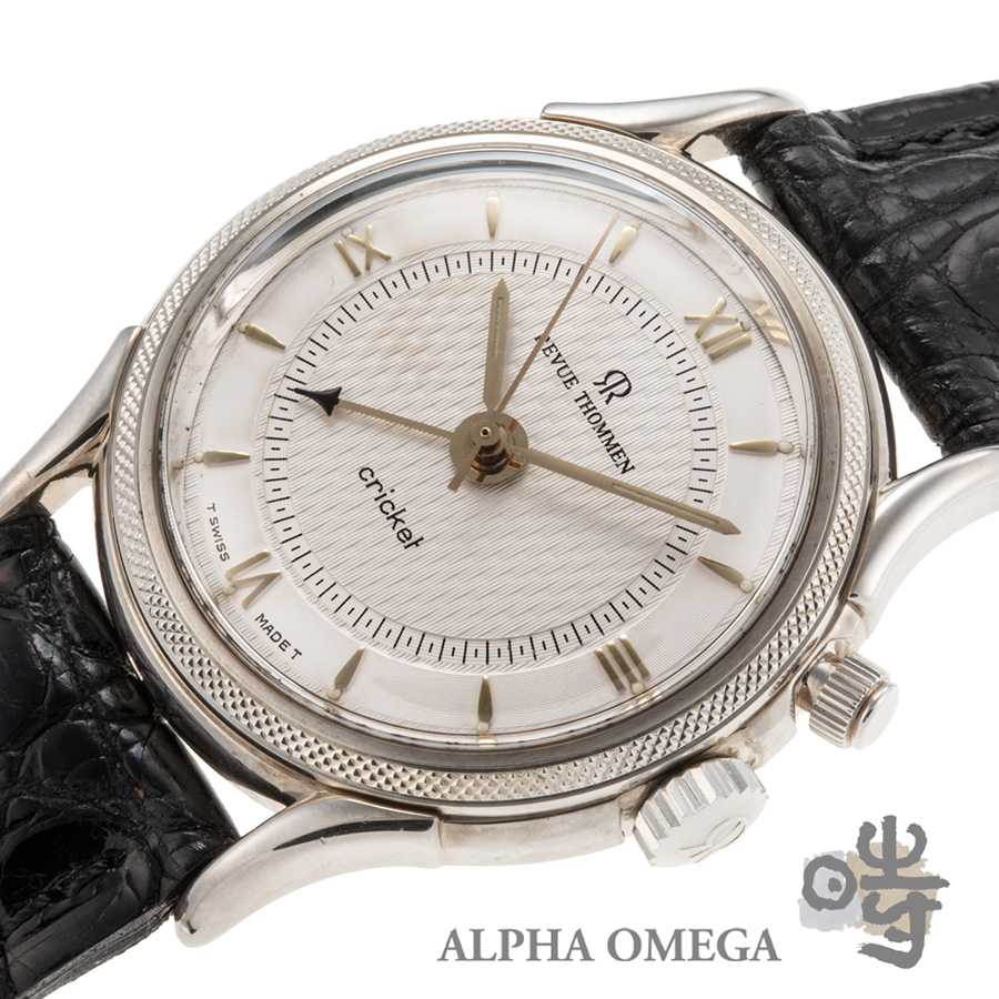 クリケットはレビュートーメンに合併される前のヴァルカン社が製造した世界初のアラーム付き時計です。クリケットの名前はスポーツのクリケットからではなく、アラーム音がコオロギの声に似ている事から付けられました。こちらは1990年代に製造された、クリケットのシルバー925モデルになります。シルバーですので、日常的に身に付けていると肌に触れる箇所は磨かれ、触れにくい場所はいぶし銀へと変化していきます。シルバー独特のエイジングも楽しめるモデルです。クリケットのアラーム音は、単なる電子音やベルのような「音」ではなく、「機械が奏でる独特の鳴き声」と表現するのがふさわしいものです。その響きを実現しているのは、クリケット特有の「二重裏蓋構造」にあります。ケース内部のハンマーが内蓋に設置されたピンを高速で叩き、その振動が外蓋にある音響孔(スリット)を通して増幅される仕組みです。この構造が生み出す音は、まさに名前の通りコオロギ(クリケット)が羽を震わせて鳴くような、ジリジリという心地よい高音の連打となって響き渡ります。特に今回の個体は、ケース素材にシルバー925が使用されている点が大きなポイントです。一般的なステンレススチール製のモデルは、鋭くキレのある金属音が特徴ですが、銀は楽器(フルートなど)にも使われるほど音響特性に優れた素材です。スチールに比べて密度が高く、わずかに柔らかい性質を持つシルバーケースを通すことで、アラーム音に特有の「まろやかさ」と「残響の深さ」が加わります。また、この時計の面白いポイントが1つのリューズで時刻とアラームの2角ゼンマイを巻き上げられる点です。リューズではゼンマイの巻き上げと時刻合わせが行えます。アラーム操作は2時側のプッシャーで行います。プッシャーを2段階押し込むとリューズが飛び出るので、この状態で12時側にリューズを回すとアラーム設定の針を回転させることが出来ます。アラームが鳴った場合も2時側のプッシャーを1度押すことで止めることが出来ます。