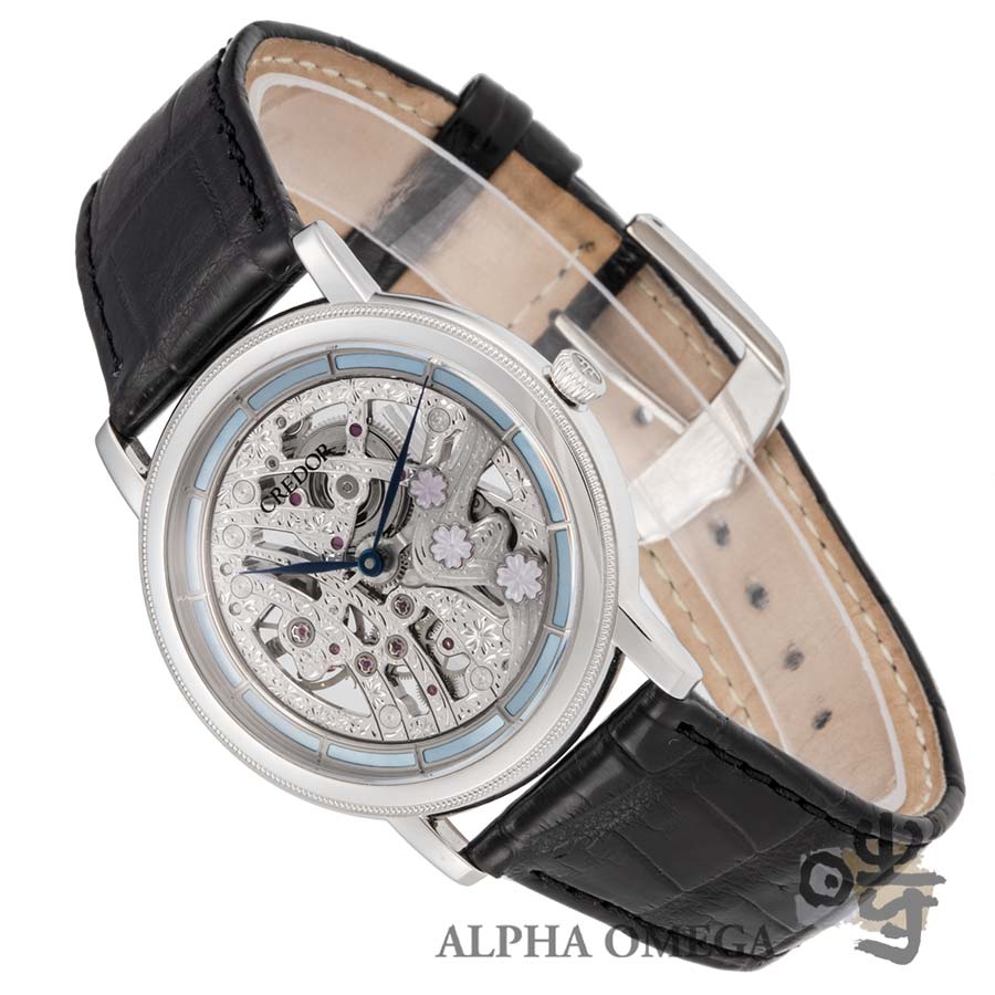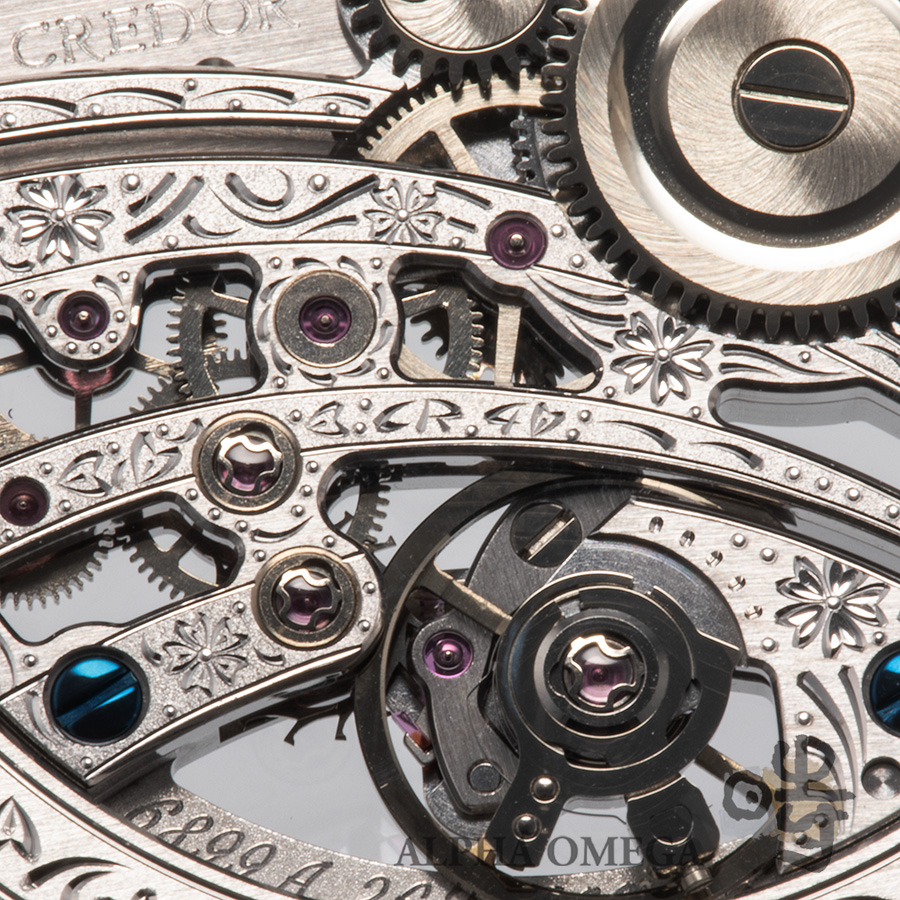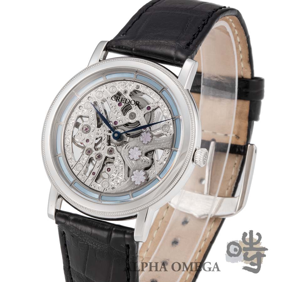 「68系」のスケルトンというだけでも、長年培った職人技が必要ですが、こちらのCal.6899Aは日本ならではの美しさを取り入れた彫金が施されていて枯山水のようです。さらにこちらの限定モデルは現代の名工である照井清氏が彫金しており、日本の伝統工芸の螺鈿細工で螺旋桜をモチーフに桜と流水の風景が施されています。3時位置から6時位置には桜が流水に乗る花筏の様子が表現され、桜の花びらが散りばめられたムーブメントは、裏表どちらから見ても美しく綺麗です。また裏には40周年を記念し2番受けのアーム上に桜の花に見立てた「CR.40」の文字を彫り込んでいます。これはオーデマ・ピゲやパテック・フィリップのアニバーサリーイヤーのロゴと比べると、デザインとの調和が考えられ、日本らしく謙虚で綺麗です。状態も良く箱とプレミアムカード付きでコレクションにもお勧めです。このアートピースが海外に流出する前に、是非ご検討下さい。