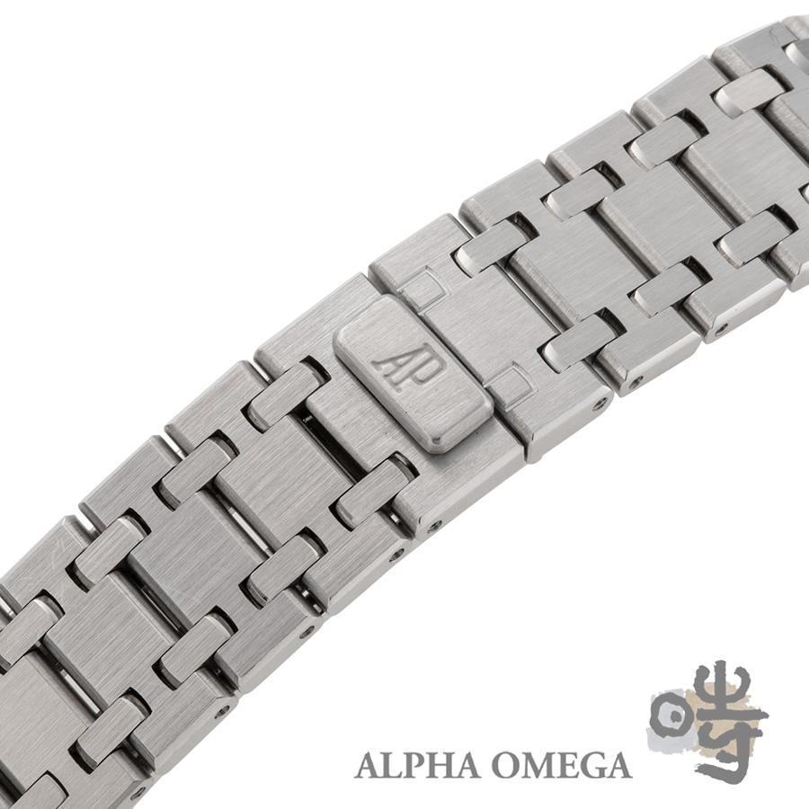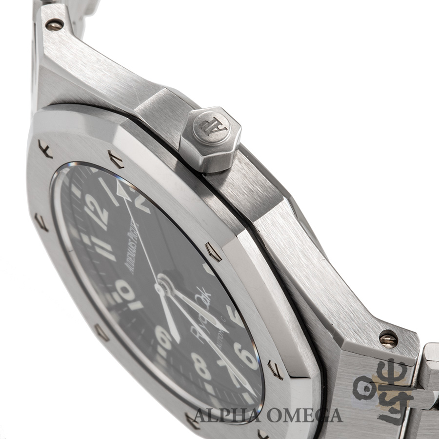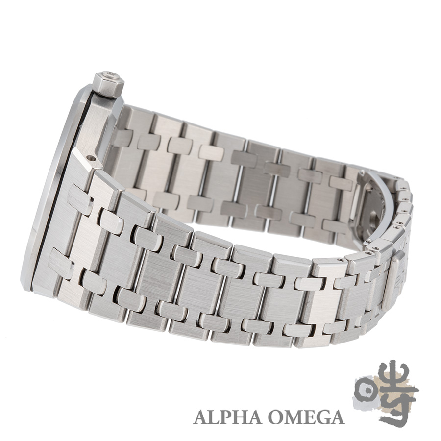 こちらは生産終了となったケース径36mmのRef.14790STです。ケース径は36mmですが、対角線の長さは約37.5mmあります。ベゼルは正面にポリッシュ、側面にヘアラインを施したメリハリのあるデザインになっており、正面から見ても側面から見ても美しいです。ロイヤルオークの中でもアラビア数字の文字盤は珍しく、さらにフラットでマットな文字盤に無造作に載せられた夜光塗料は男らしさを感じます。こちらの様な未研磨の綺麗な個体の現存数は少ないと思います。