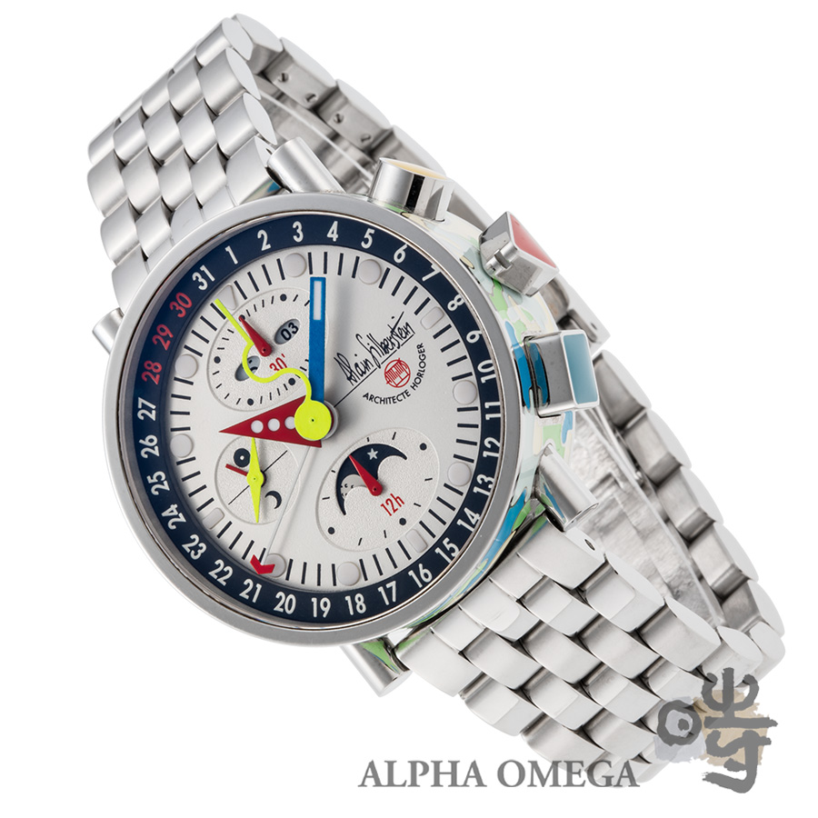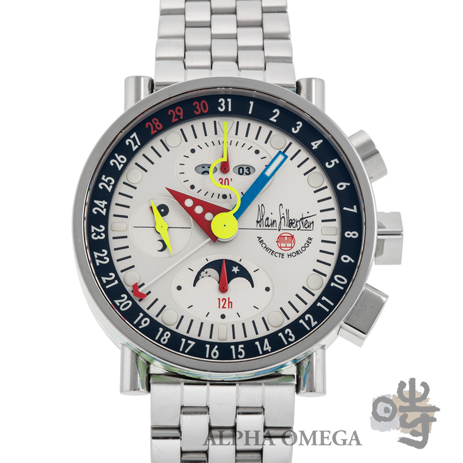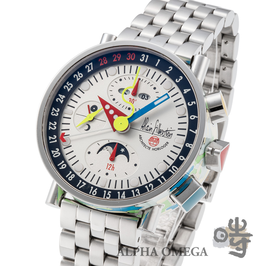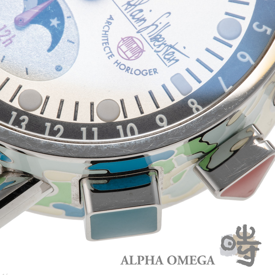 アラン・シルベスタインとはフランス出身の時計デザイナーで、独立時計師というよりはウォッチビルダーです。バウハウスに基づいた、幾何学模様と原色の色使いを得意として、クラシックにとらわれず複雑時計も制作していました。1987年から自身の時計会社で時計を作っていましたが、2012年に突然閉業し、現在はコレクター向けに他の時計メーカーと協力して自身のデザインの時計を作っています。