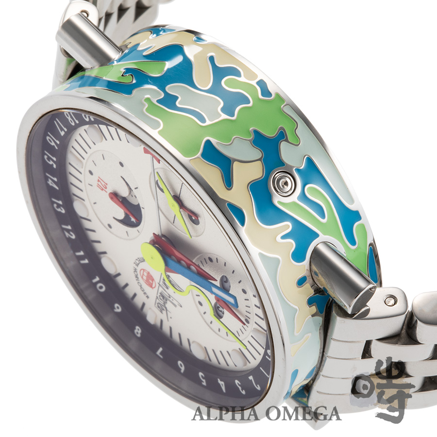 こちらのクロノバウハウス2はクロノグラフ、トリプルカレンダー、ムーンフェイズ、デイナイトの表示を備えた「愛好家なら1つは手に入れたい」人気のコレクションです。曜日ごとに変わる顔がアートであり、アラン・シルベスタインらしさでもあります。ケースサイドのカモフラージュはケースの表面を薬品で溶かし、レーザーで模様の輪郭を描いてラッカーを流し込んで焼くという特殊な技法が施されています。