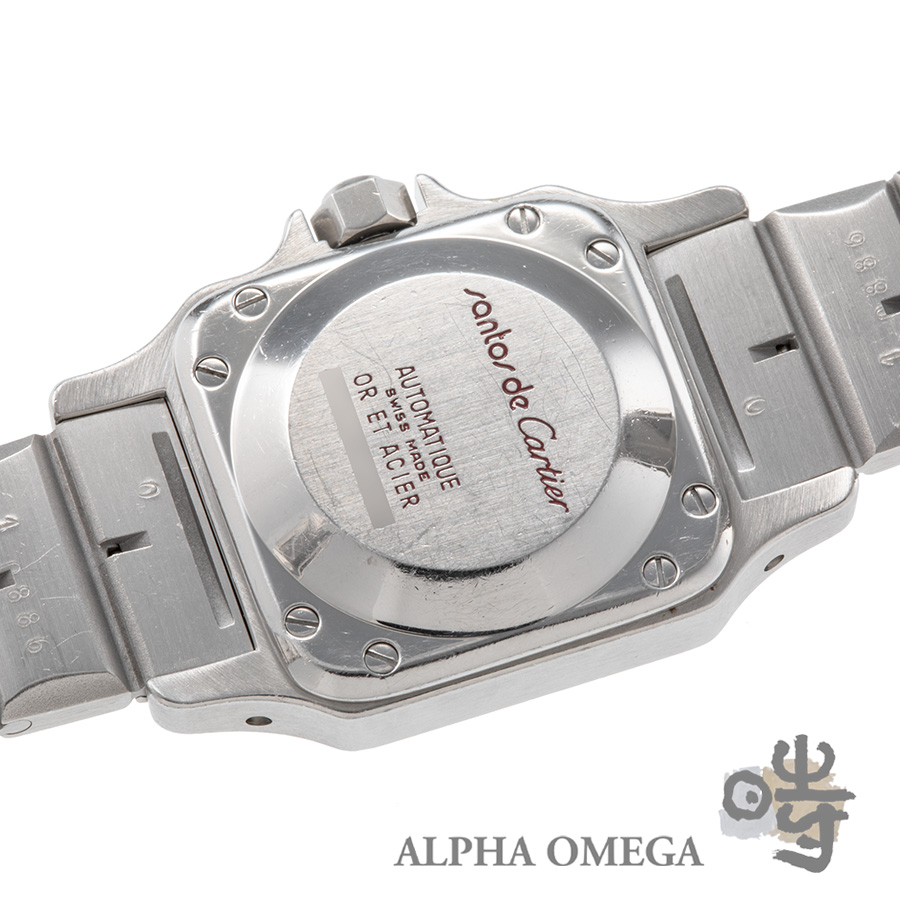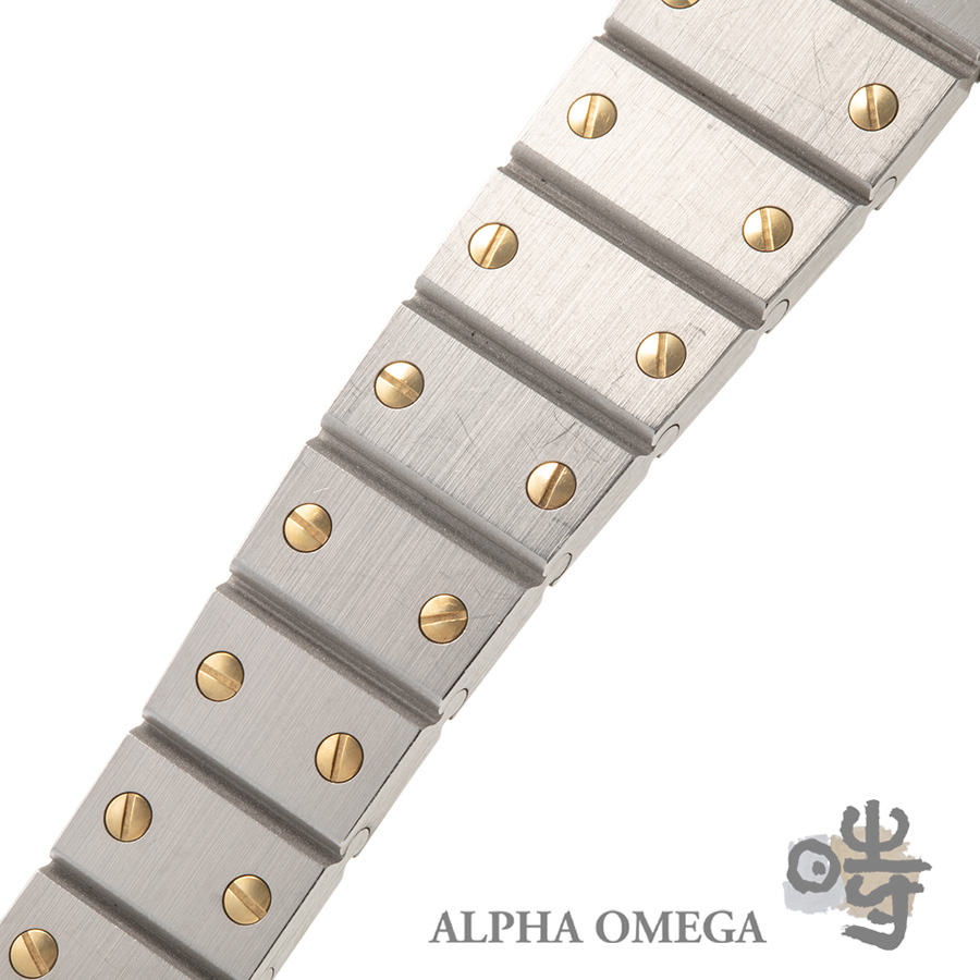 1970年代後半、ノーチラスやロイヤルオークといったスチール製スポーツウォッチが台頭する中、カルティエがその時代の風を読み、初めてスチールを取り入れて発表したのが、この「サントスカレ」です。ジェラルド・ジェンタのデザインが世界を席巻していた時代背景もあり、この工業的で力強いブレスレットの意匠には、当時のラグジュアリースポーツの熱狂が色濃く反映されています。それはカルティエの気品を保ちながらも、工業的ながらも洗練された構造美が宿ったデザインです。