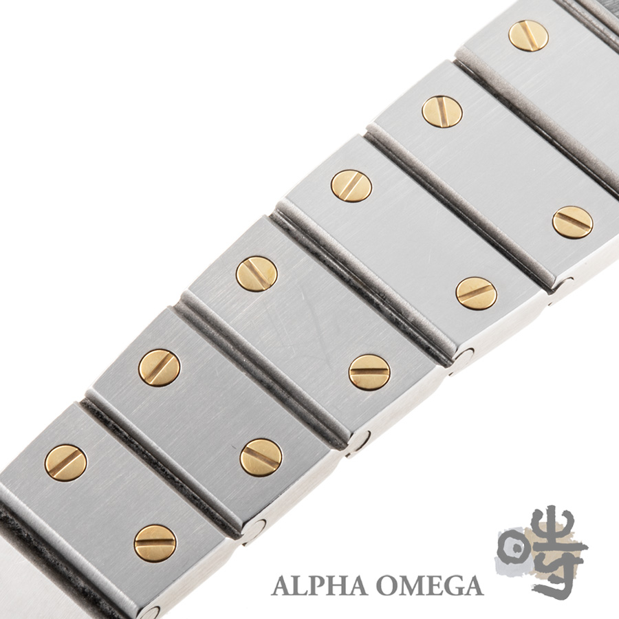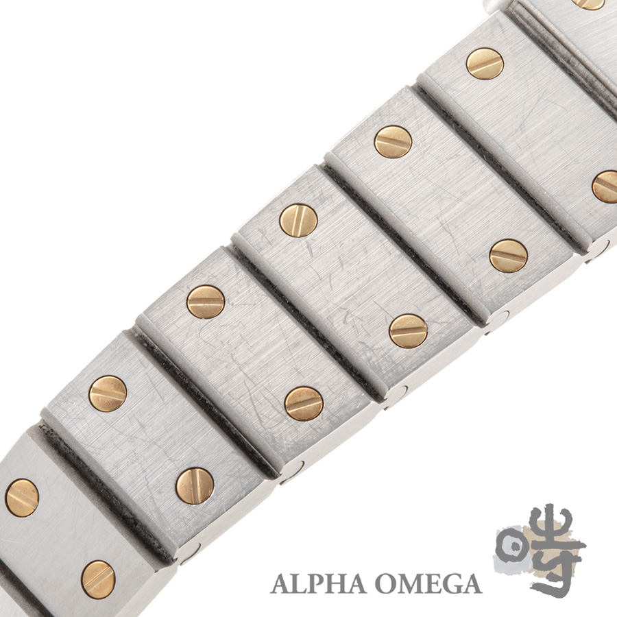 1970年代後半、ノーチラスやロイヤルオークといったスチール製スポーツウォッチが台頭する中、カルティエがその時代の風を読み、初めてスチールを取り入れて発表したのが、この「サントスカレ」です。ジェラルド・ジェンタのデザインが世界を席巻していた時代背景もあり、この工業的で力強いブレスレットの意匠には、当時のラグジュアリースポーツの熱狂が色濃く反映されています。それはカルティエの気品を保ちながらも、工業的ながらも洗練された構造美が宿ったデザインです。
