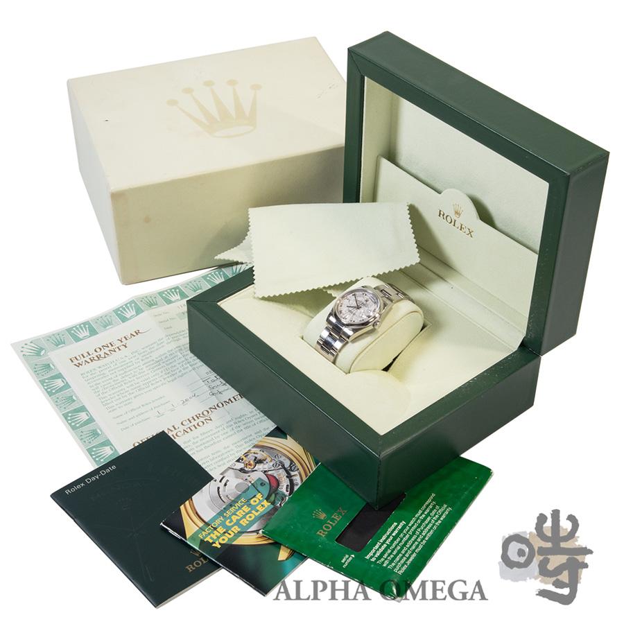 こちらは大変希少なオイスターオンオイスターのメテオダイアルになります。デイデイトでオイスターベゼルとオイスターブレスレットの組合せは少なく、4桁や5桁のヴィンテージモデルでは通常の組合せよりも高くなります。そこに石文字盤が入った組合せは4桁は幻、ファクトリー文字盤に交換された5桁でさえ1000万円を超えます。保証書は文句のつけようが無い「出荷時の文字盤か記入されたUSギャラ」で業界の闇も心配いりません。