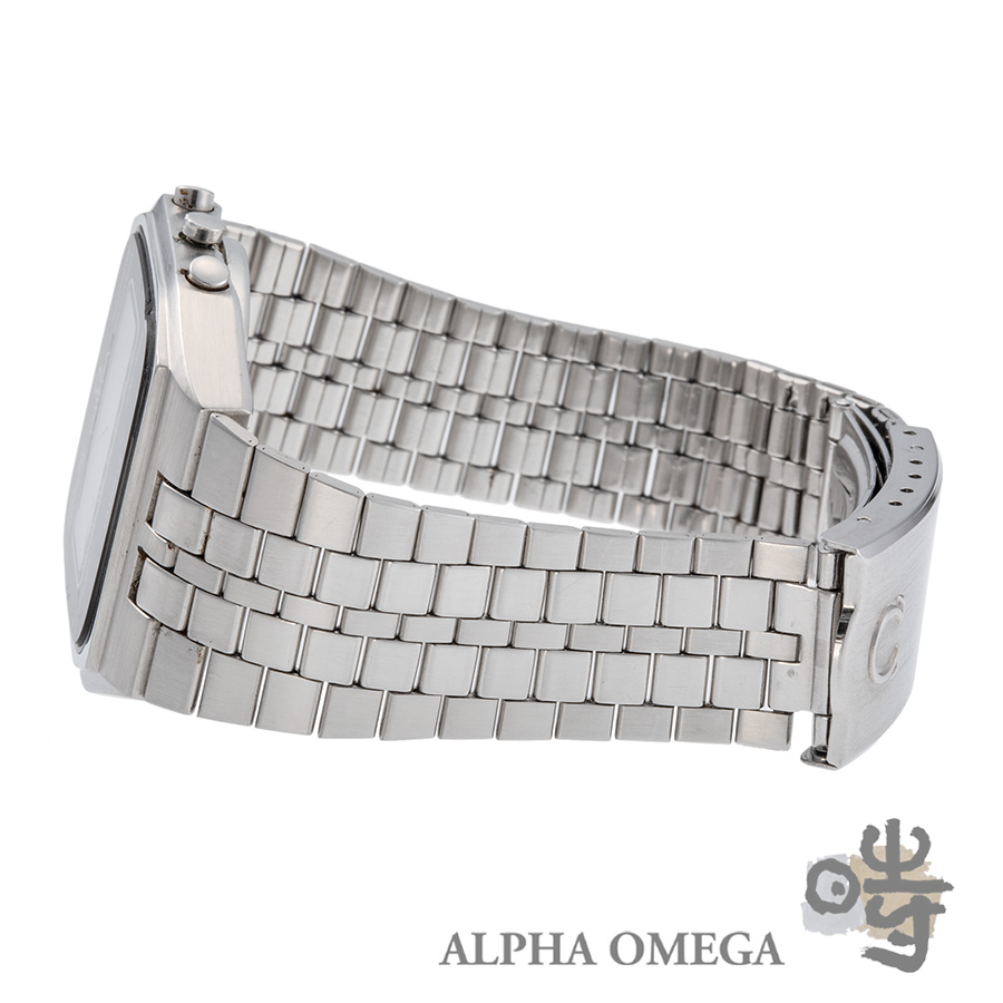 状態はケースとミネラルガラスに小キズこそございますが、検品時にはバックライトを含めた全機能が元気に動作しております。ブレスレットも希少な純正ブレスが付属しています。スピードマスターのクォーツはラウンドモデルが多く、テレビスクリーンの形は希少です。クォーツファンではない方でも、唯一無二の個性がありオススメです。ヴィンテージブームもさることながら、当時のエンジニアたちが夢見た「未来の形」をそのまま腕に乗せる。それは、数多あるスピードマスターの中でも、お客さまの個性を最も象徴する特別な1本なるはずです。(文:S)※弊社一年間保証対象外商品です。3時プッシャーの戻りが時々悪いです。
