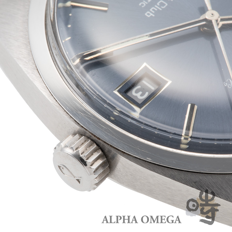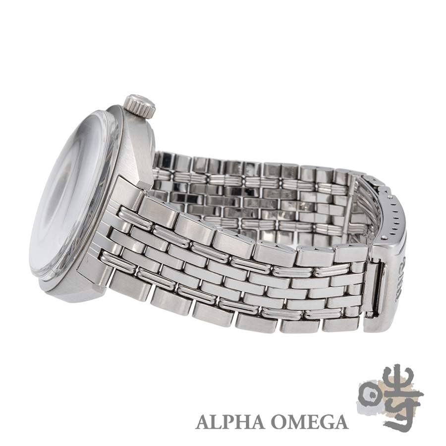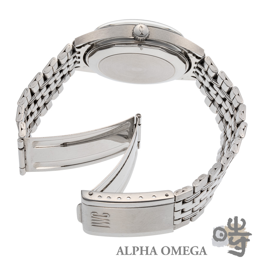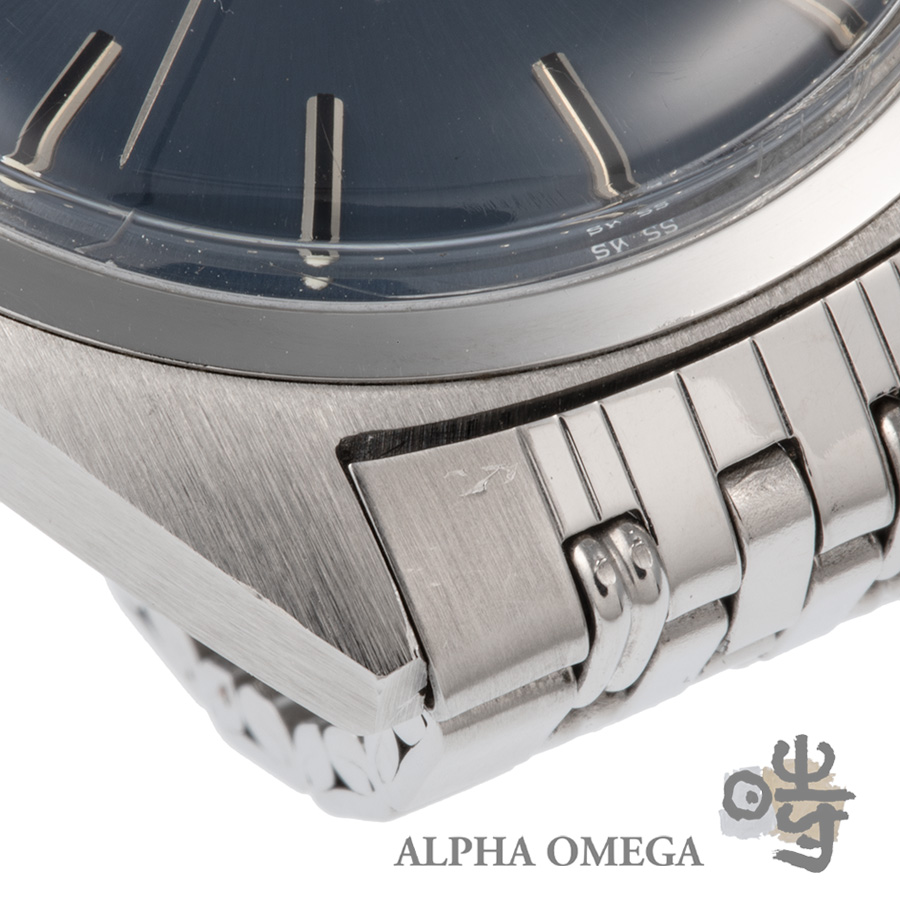 この個体を特別なものにしているのが、その鮮やかなブルー文字盤です。これは極めて状態の良いオリジナルのブルー文字盤で、そこにヴィンテージファン垂涎のゲイフレアー社の製5連ブレスが組み合わさっています。ブレスのヨレも少なく、弊社でのオーバーホールも済ませておりますので、手にしたその日から最高のコンディションでお愉しみ頂けます。