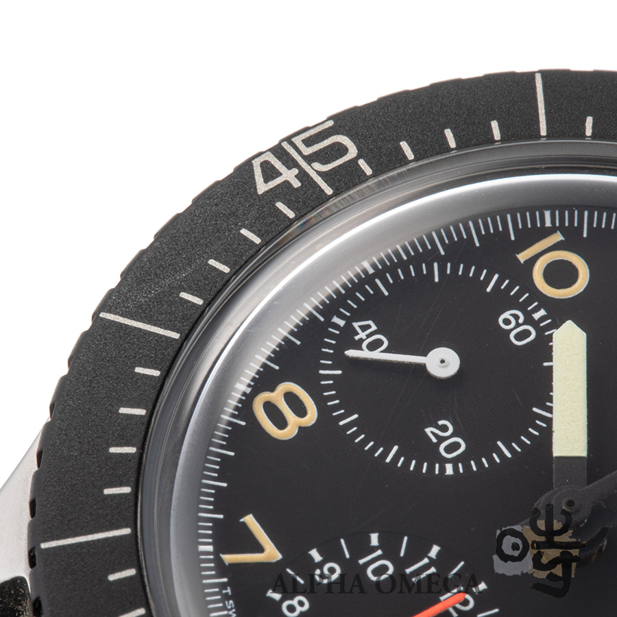 こちらは256Pです。信頼性の高いバルジュー7750を使用しています。Cal.7750は自動巻クロノグラフの組み合わせをコストを抑えながらも高い品質を求めて作られた名機で、汎用機のため部品の数も多く、修理面でも心配がいらない点も魅力的です。ケース径は大きくなりがちなパイロットウォッチでは38.5mmと日本人の腕にも馴染みやすいサイズ感です。両方向回転ベゼルを採用しており、アルミニウムの表面に、酸化皮膜を生成し黒色に染色するブラックアルマイト加工を施しています。ベゼルは擦り傷などでキズが付いている個体が多いですが、こちらは目立つキズもなくベゼルは良好な状態です。ケースは使用感の見られない未研磨の個体となっております。目立つキズもなくご購入後からあまり使われていない印象を受ける個体です。ダイアルの夜行もクリーミーに経年変化したオススメの固体です。(文:S)