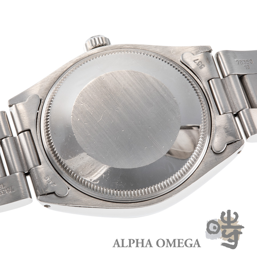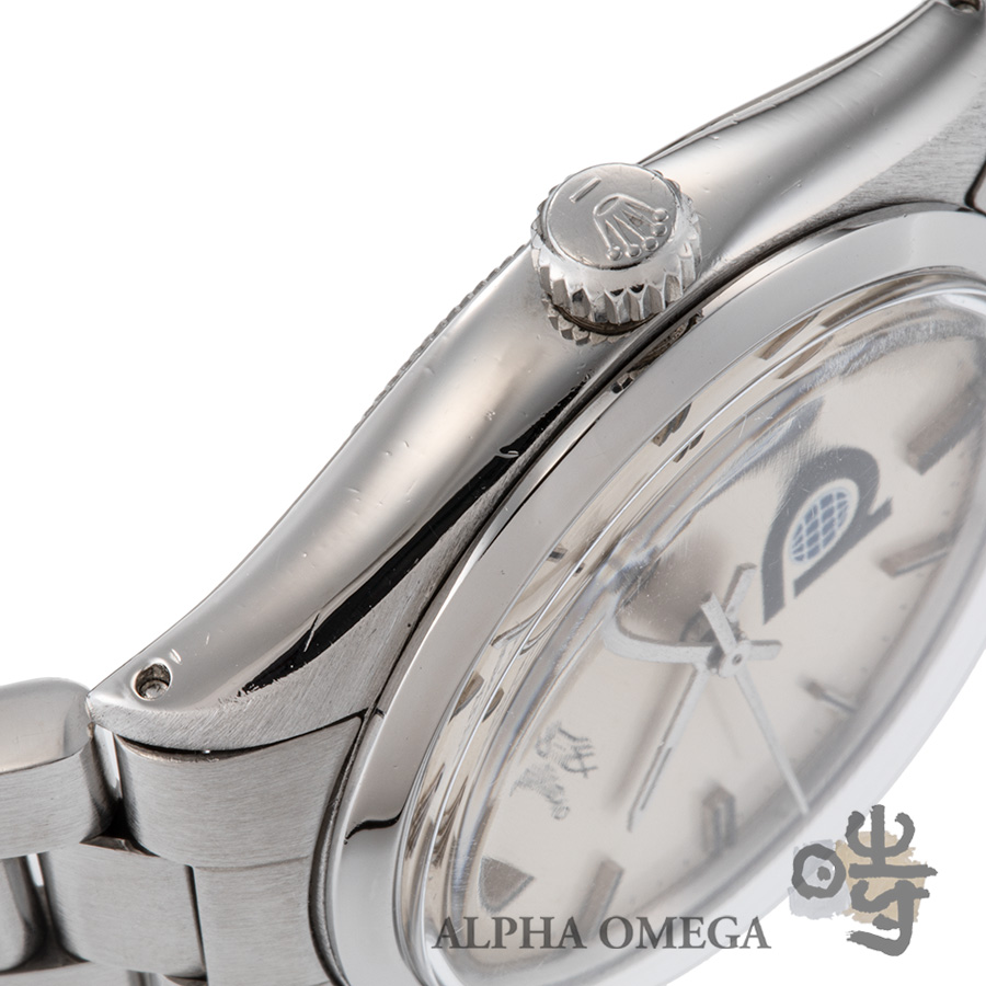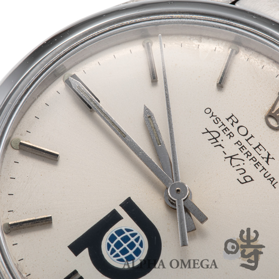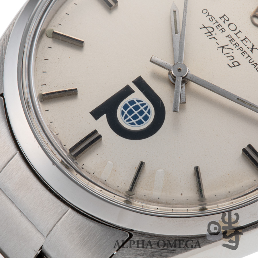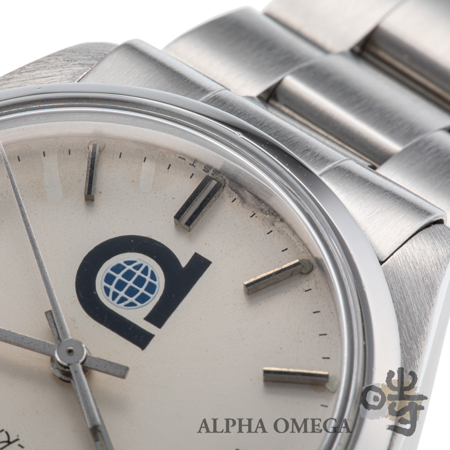 こちらは成熟期にあたる1981年製のダブルネームモデルになります。当時のロレックスは、世界各国の軍隊や特定の民間企業からの特注依頼に応じて、ダイアルに意匠を施すことがありました。当時の特注品はダイアルにロゴを入れるのが主流で、こちらもコレクター心をくすぐる特注モデルです。6時位置に堂々とプリントされた「P」の文字。これはかつて石油採掘やインフラ事業を手掛けていた「プール・インタエアドリル」社のロゴマークです。この特注モデルは1970年代後半から1980年代初頭まで生産されていましたが、こちらの個体は製造年を加味すると比較的に最終盤に近い個体です。こちらは会社が、安全賞などの功労を称えて、従業員に送ったとされており、従業員の労働の誉とも呼べる品物です。また面白いのが、ヴィンテージ市場の情報が少なかった時代、この「P」ロゴが航空会社の「パンナム航空」の頭文字と勘違いされ、日本国内では「パンナム」という愛称で親しまれてきた歴史があることです。こういったすれ違いも、ヴィンテージならではの豊かな物語として時計のストーリーに刻まれています。