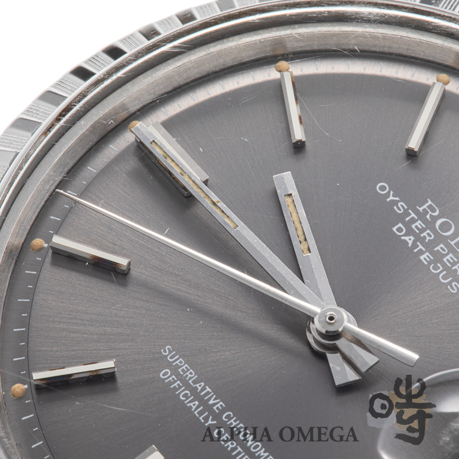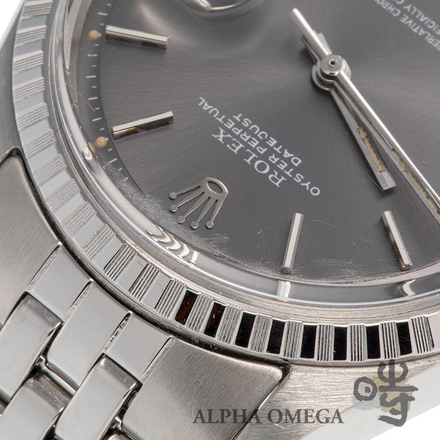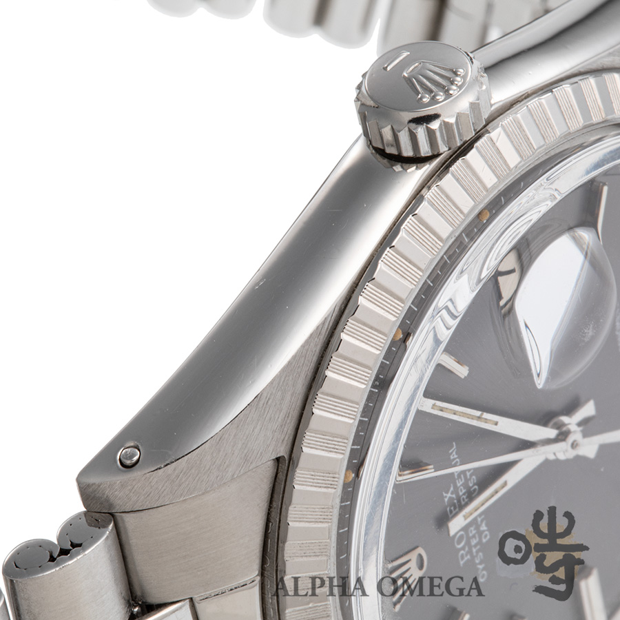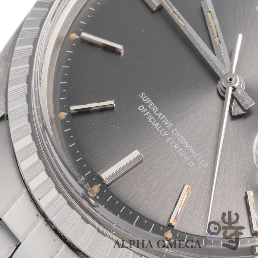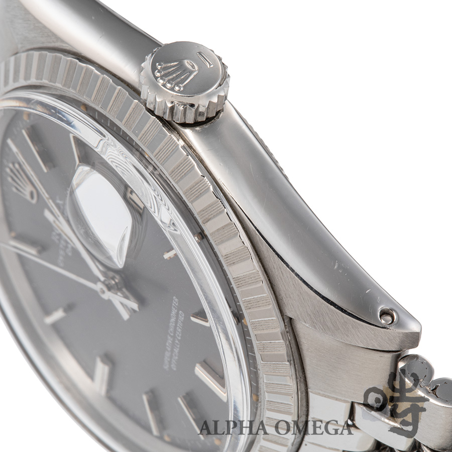 こちらは1959年から1979年までの20年間製造されていた第3世代のRef.1603です。文字盤の外周が一段低くなった、いわゆる「段落ちダイアル」が出す立体感は、この時代の個体でしか味わえない格別なディテールです。昨今のヴィンテージ市場では、カラーダイヤルの価値が上昇しており、こちらは特に人気のグレーダイアルとなっています。最近ではデイトジャスト全体を見てもカラーダイヤルに巡り会える機会はかなり少なくなりました。特にグレーダイアルは「状態の良いものを見つけたら即決」と言っても過言ではないほどに姿を消しつつあります。