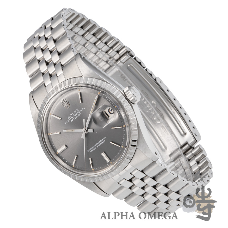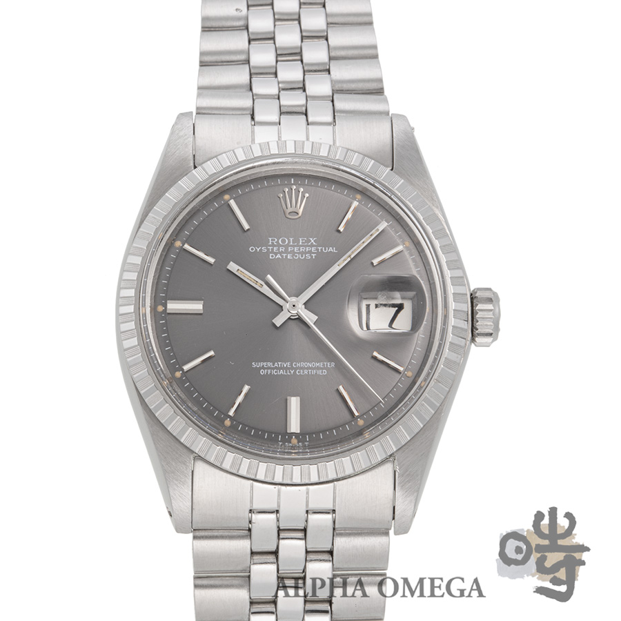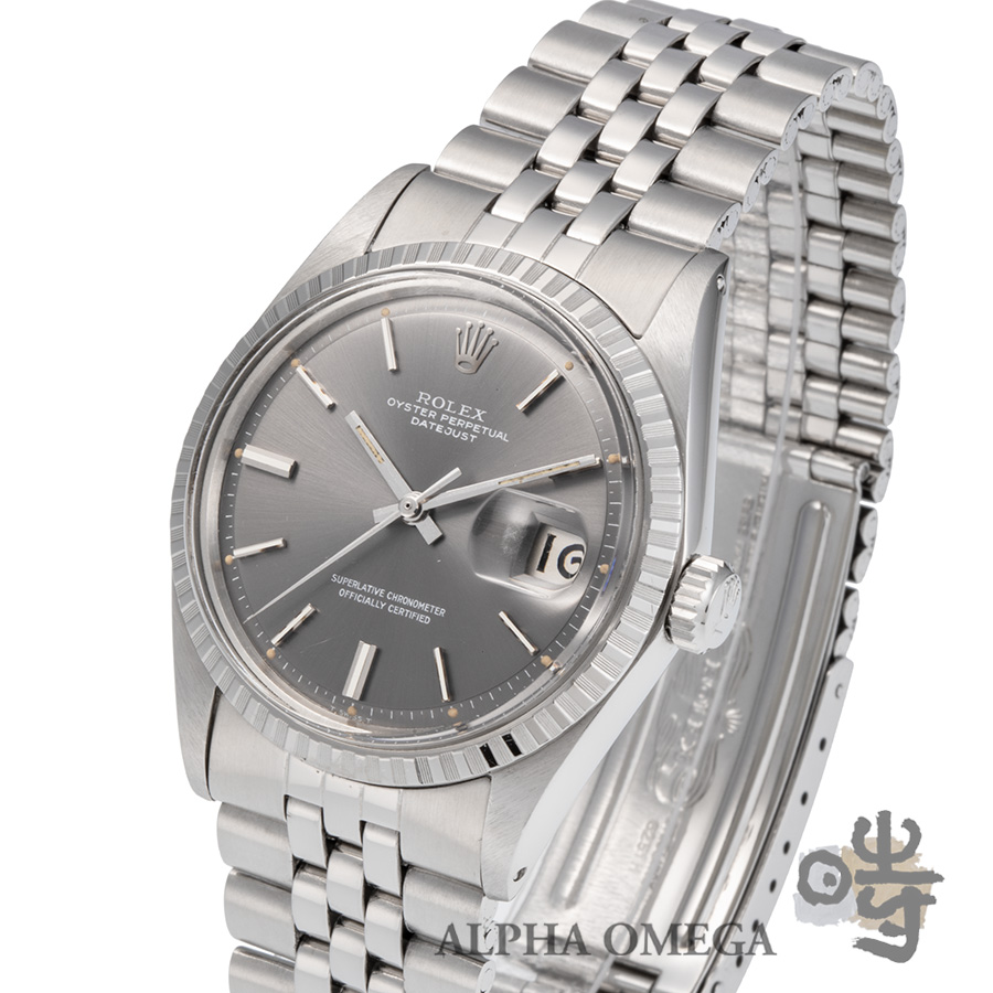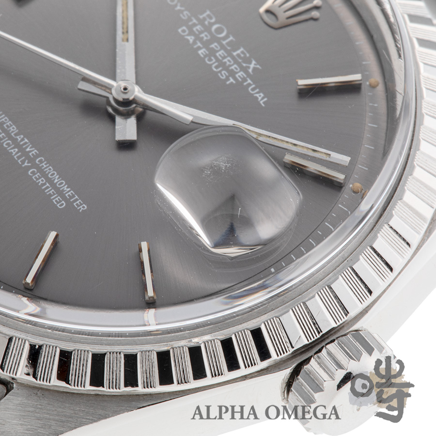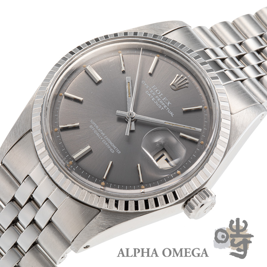 こちらは1959年から1979年までの20年間製造されていた第3世代のRef.1603です。文字盤の外周が一段低くなった、いわゆる「段落ちダイアル」が出す立体感は、この時代の個体でしか味わえない格別なディテールです。昨今のヴィンテージ市場では、カラーダイヤルの価値が上昇しており、こちらは特に人気のグレーダイアルとなっています。最近ではデイトジャスト全体を見てもカラーダイヤルに巡り会える機会はかなり少なくなりました。特にグレーダイアルは「状態の良いものを見つけたら即決」と言っても過言ではないほどに姿を消しつつあります。