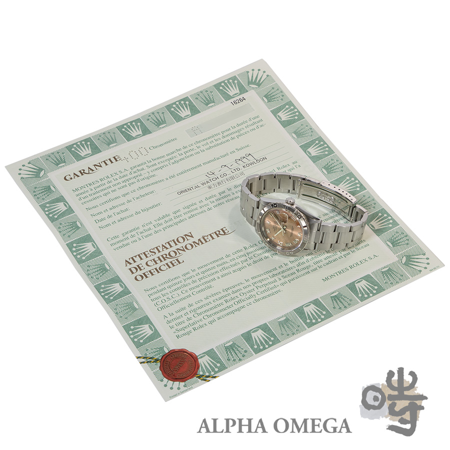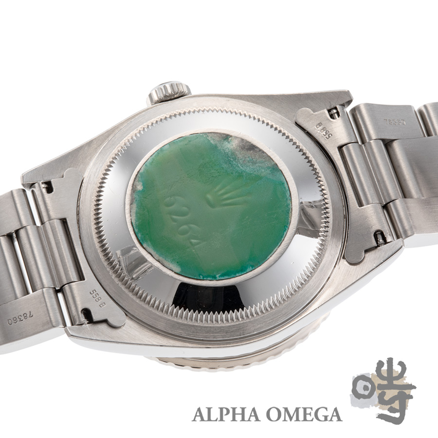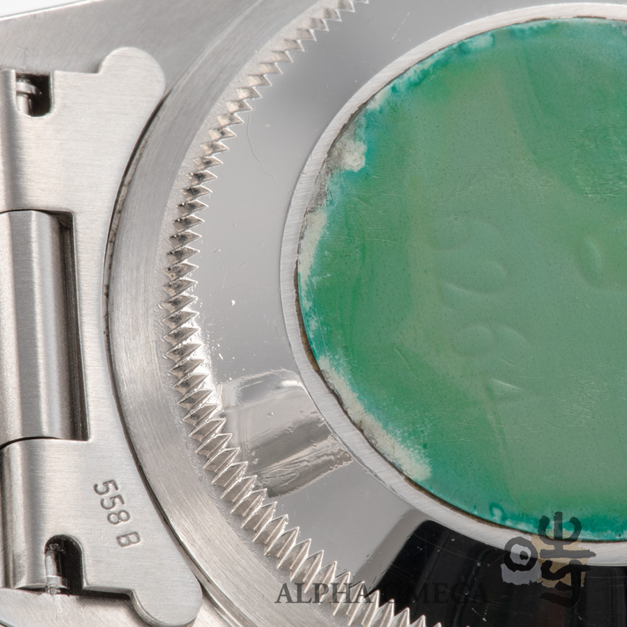 状態は過去に研磨は行われていますが、ベゼルやケースのエッジはしっかりとしています。大きな打ち傷などは見られず、ガラス欠けもございません。全体を通して良好です。裏蓋にも出荷当時のシールが残っており、前オーナーさまが大切に扱ってきたことが伝わる、保証書が付属したオススメの個体です。(文:S)
