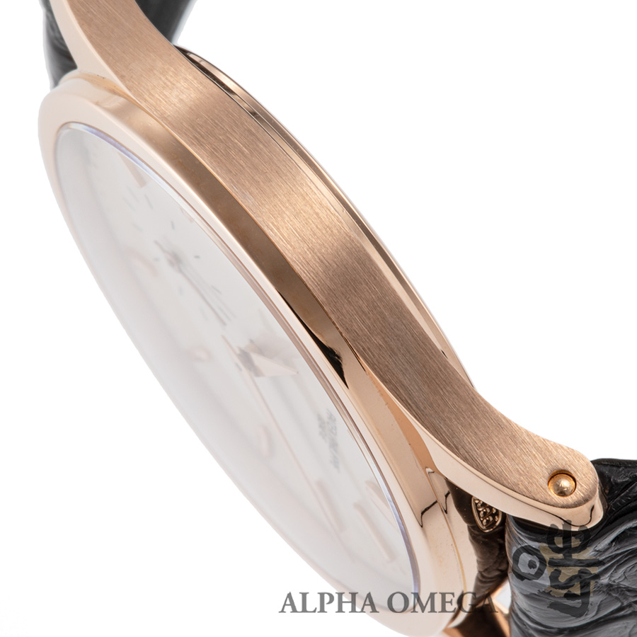 エナメルのようなトロッとした柔らかさと温かみのある文字盤の質感は、最高級の時計としてのオーラを放っています。そのダイアルにセットされるのはゴールド製のダイアカットされたインデックスとシャープなドーフィンハンズ。この磨き込まれた針とインデックスがもたらす煌めきと、柔らかな文字盤のコントラストが最高です。パールドットインデックスなどまさにRef96のアップデートモデルと言うにふさわしい時計です。