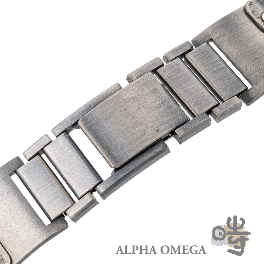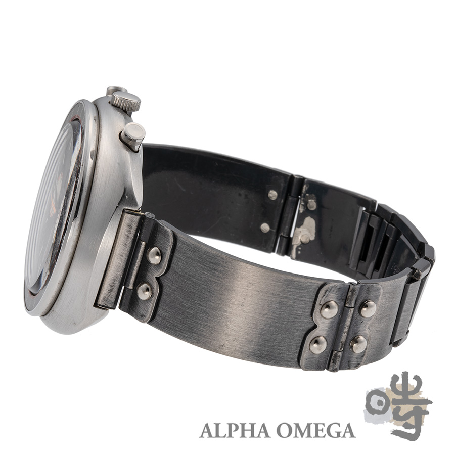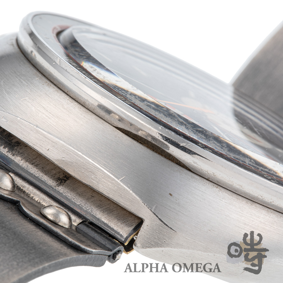 こちらは、当時のレトロフューチャーの雰囲気を色濃く残す国産ヴィンテージブレスをマッチングさせました。リベットが連なるデザインは、1970年代のスーパーロボットの様で、時計本体のボリューム感とカラーリングに負けない強烈な個性を放ち、さながら「ジャイアントロボ」のであるかのような一体感を演出しています。ケースは当時のヘアラインが残る未研磨の個体になります。塗装が剥げがちなベゼルのインク嫌いな発色がしっかりと残っています。地板の夜行塗料もクリーミーに変化しており国産ヴィンテージの入門としても、楽しめる1本です。古着屋やアメカジとも親和性の高いオススメのモデルです。(文:S)