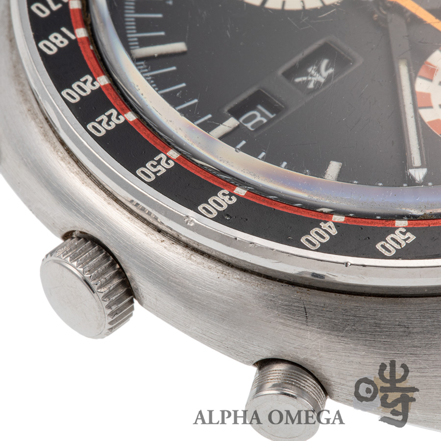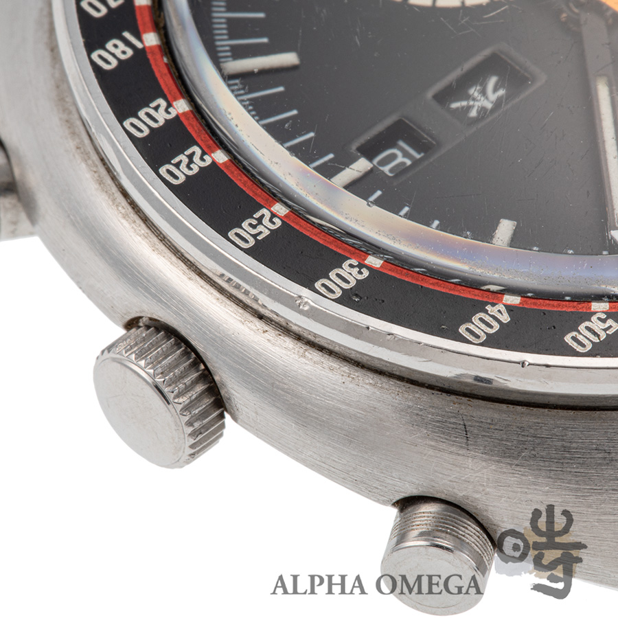 こちらは1970年から1979年までの9年間製造された、セイコースピードタイマー通称「UFO」です。その名の通り、空飛ぶ円盤のようなケース形状が特徴的で、興行的にも大成功を収め国内だけではなく世界的にも市場を広げました。UFOには国内市場向けと海外向けが存在しており、針の形やカレンダーの表記が異なります。こちらは国内市場向け(JDM)モデルになります。当時の大卒初任給が4万円の時代に、約2万円の定価で販売されていました。(現代の12万円前後)